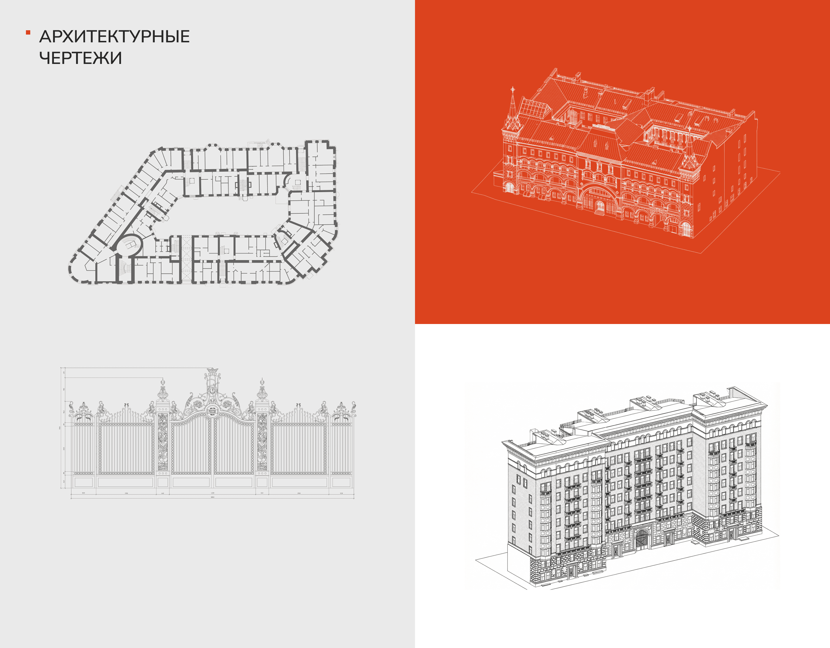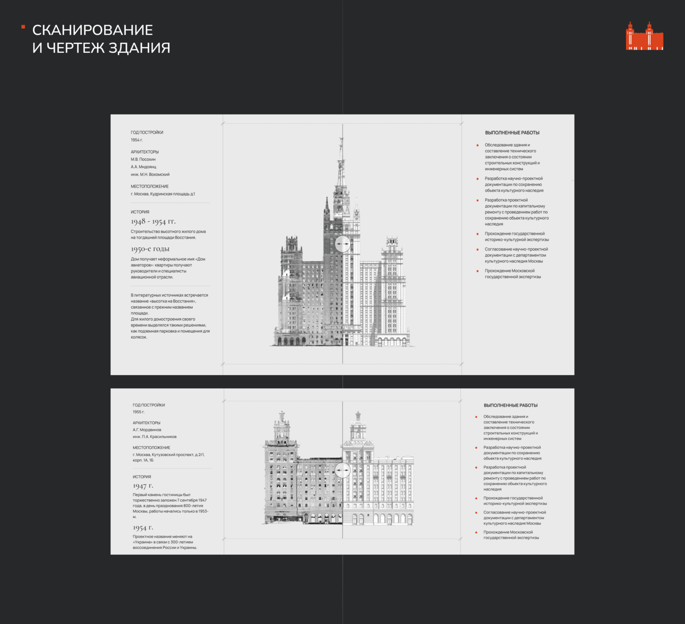 В центре страницы разместили слайдер «до и после». Пользователь видит, как выглядел объект на этапе обследования и что получилось в результате на архитектурном чертеже — в формате проектной документации.