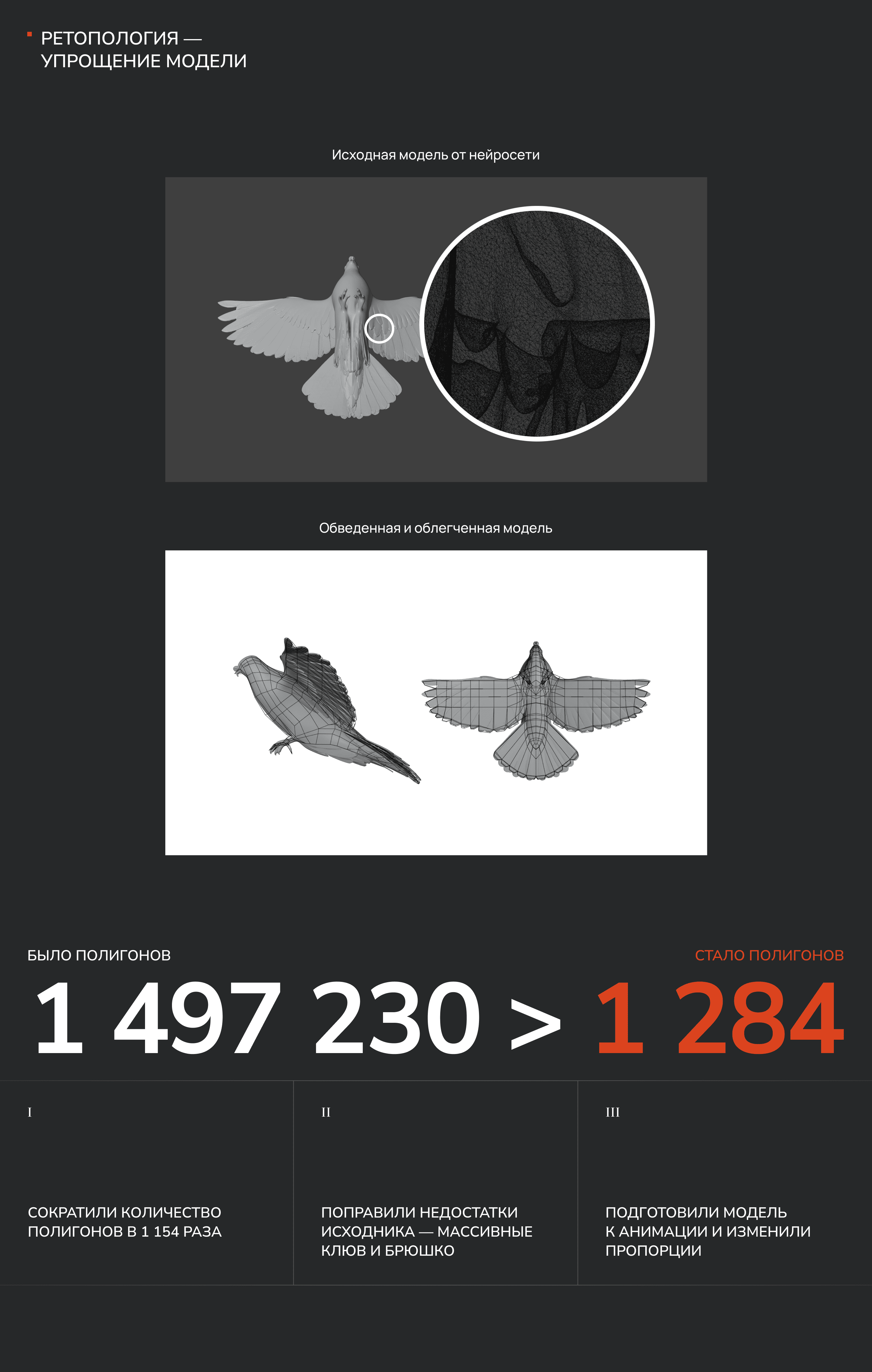 За основу взяли сгенерированную в неройсети модель, после чего «обвели» ее по готовым контурам, учитывая будущие задачи. Например, нейросеть отдала птицу со слишком большим брюшком, которое бы потом искажало движение полета — так что лишнее было обрезано :)