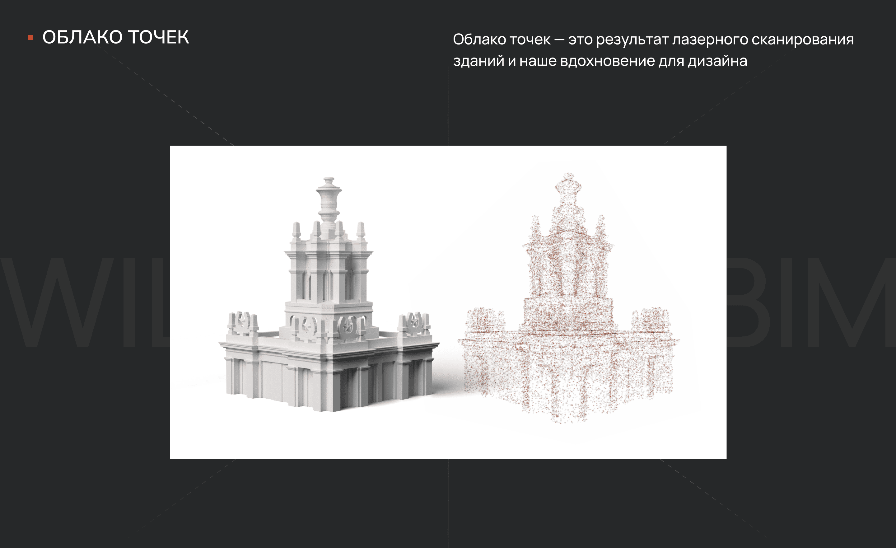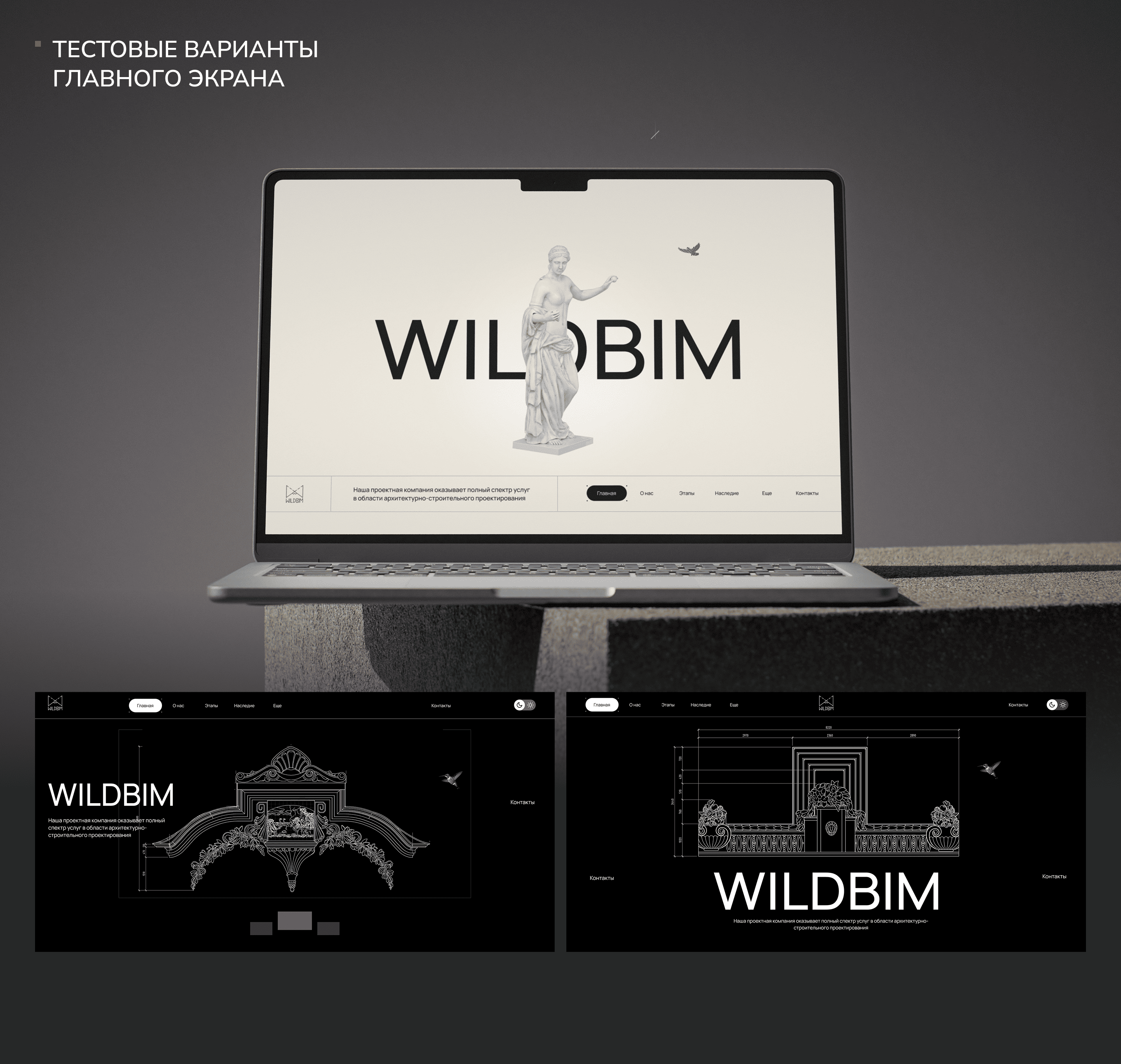На первом экране нужно было сразу передать характер деятельности компании. Мы пробовали несколько вариантов: барельефы из реальных проектов заказчика, классические скульптуры и колонны. Но в итоге остановились на облаке точек — это результат BIM-проектирования, а использование BIM в реставрации является конкурентным преимуществом клиента. Так мы нашли классный объект для дальнейшей анимации и при этом показали сильную сторону бюро.