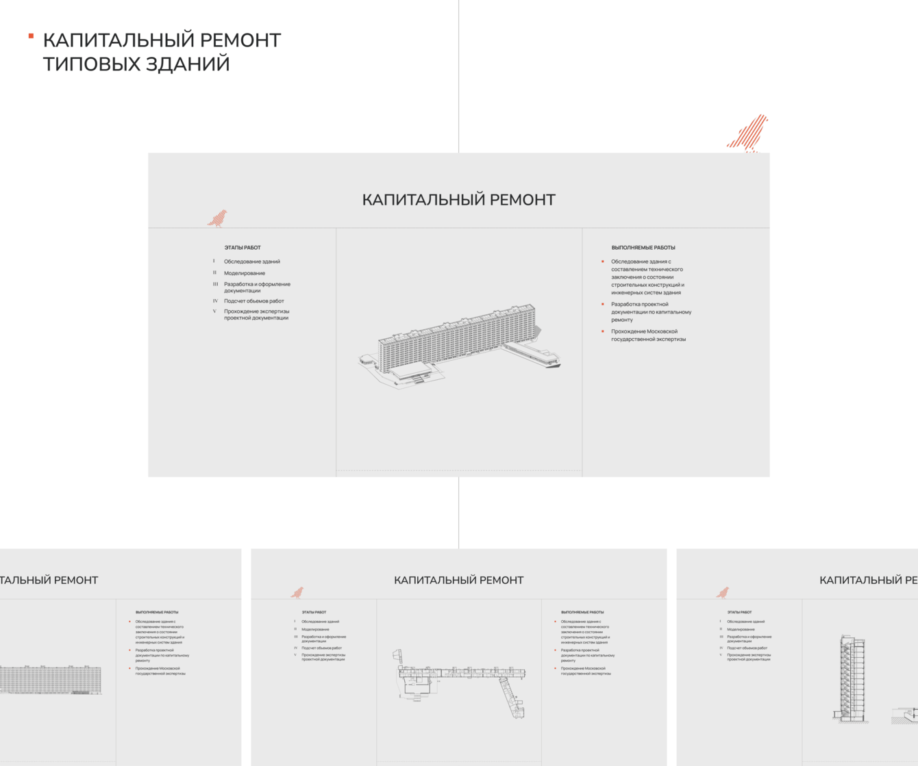Помимо объектов наследия заказчик работает с капитальным ремонтом и модернизацией типовых зданий. Мы выделили направление в отдельный блок, чтобы показать, что бюро берет проекты разного масштаба. Раньше информация об этой услуге отсутствовала, теперь бюро не теряет потенциальные заявки от клиентов, заинтересованных этим направлением.