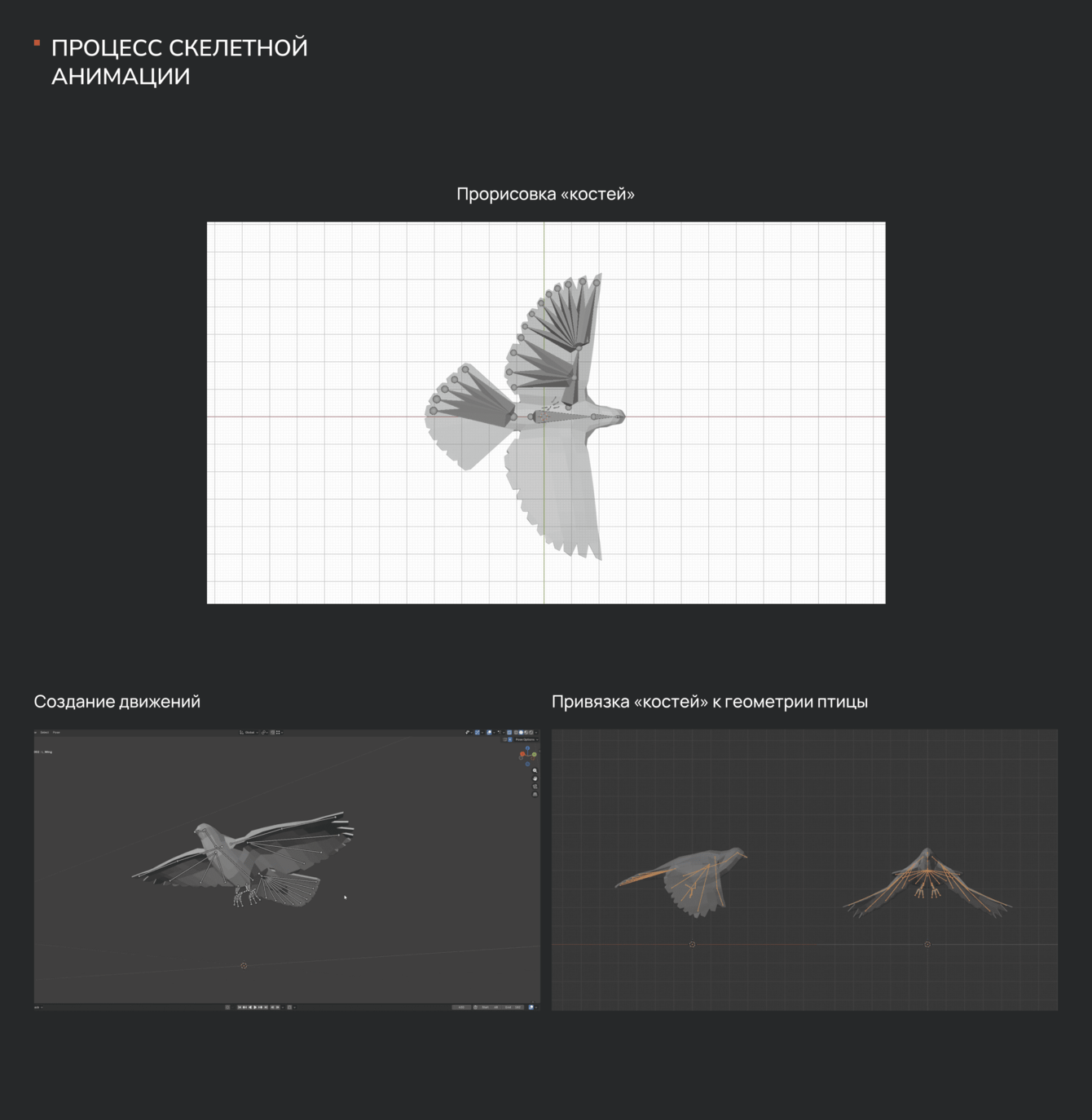 Анимировали модель с помощью скелетной анимации — простой анимации крыльев было бы недостаточно, потому что мы хотели, чтобы она садилась на здание, взлетала и шевелилась. Сначала нарисовали внутри модели кости — треугольники, которые образуют скелет. Далее привязали к костям геометрию птицы в Blender и двигали модель для создания полета и других сцен.