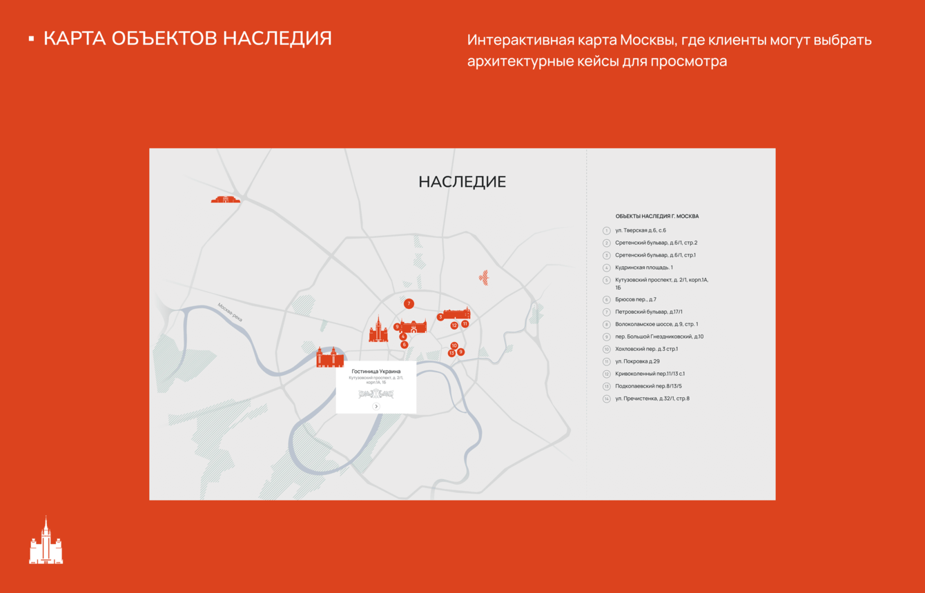 — Выделили объекты наследия в отдельный раздел. Показали 14 зданий на карте Москвы. У каждого строения — своя страница со слайдером «до и после» с детальной отрисовкой и уникальными элементами объекта.