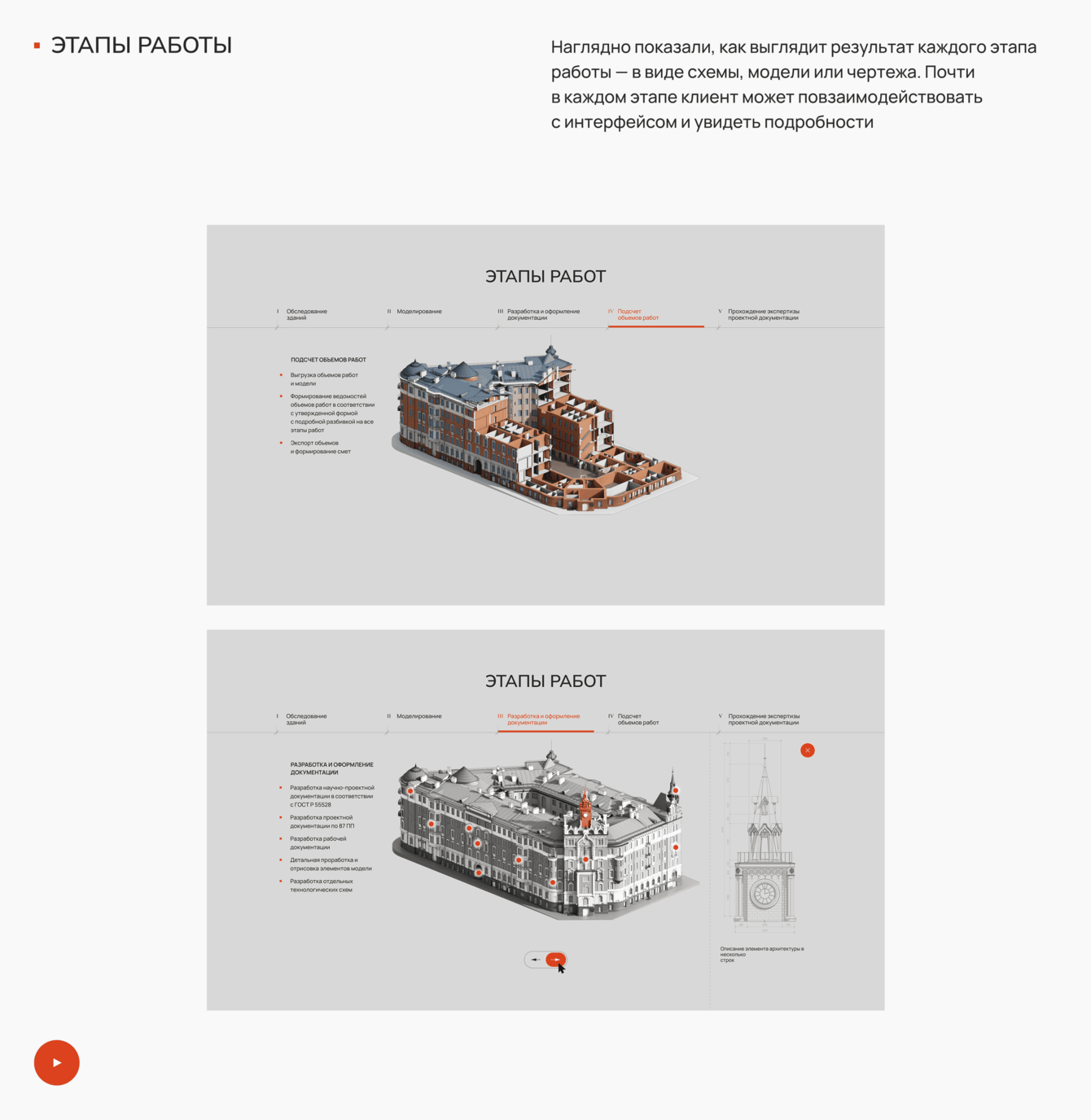 — Спроектировали раздел «Этапы работ» с трансформацией модели. Пять табов, в каждом из которых здание меняется от скана до готовой модели.