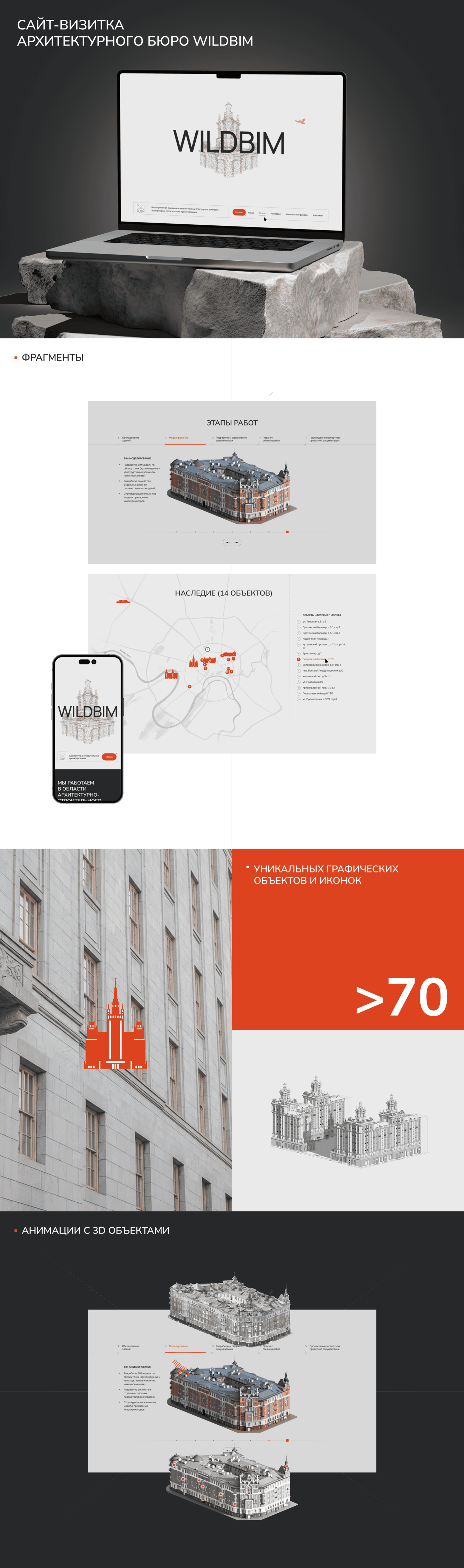 Бюро работает со знаковыми историческими объектами Москвы: сталинские высотки и памятники архитектуры. Портфолио нужно было показать подробно и интерактивно. Вместе с заказчиком мы оформили 14 зданий в отдельный раздел со стилизованной картой Москвы. Так клиенты сразу видят географию, масштаб работ и сильный опыт компании.