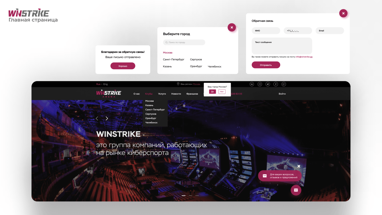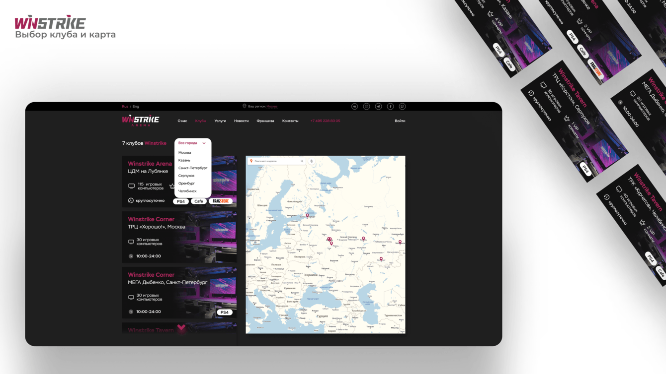 Winstrike, как стартап, планировал развиваться за счет продажи собственной франшизы. Поэтому на сайте мы также собрали информацию о клубах в разных городах и офер для потенциальных покупателей франшизы.