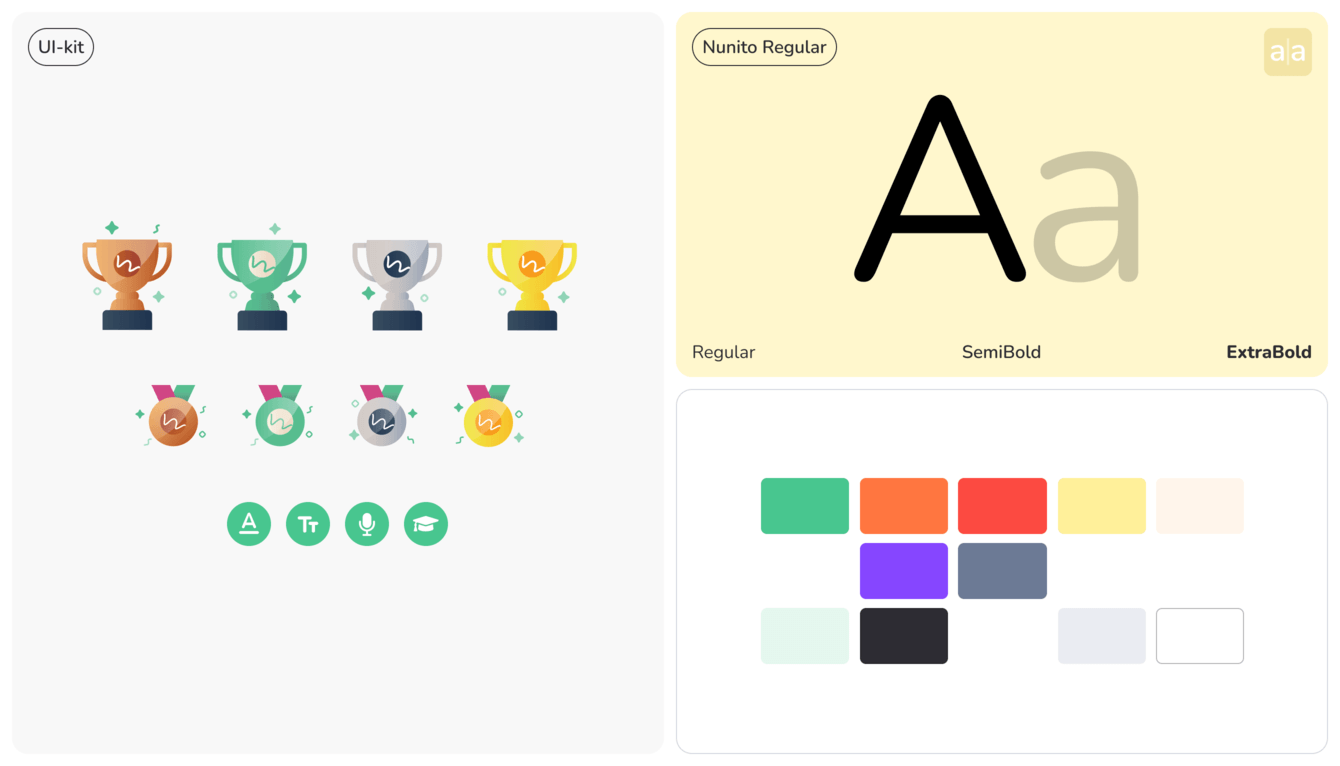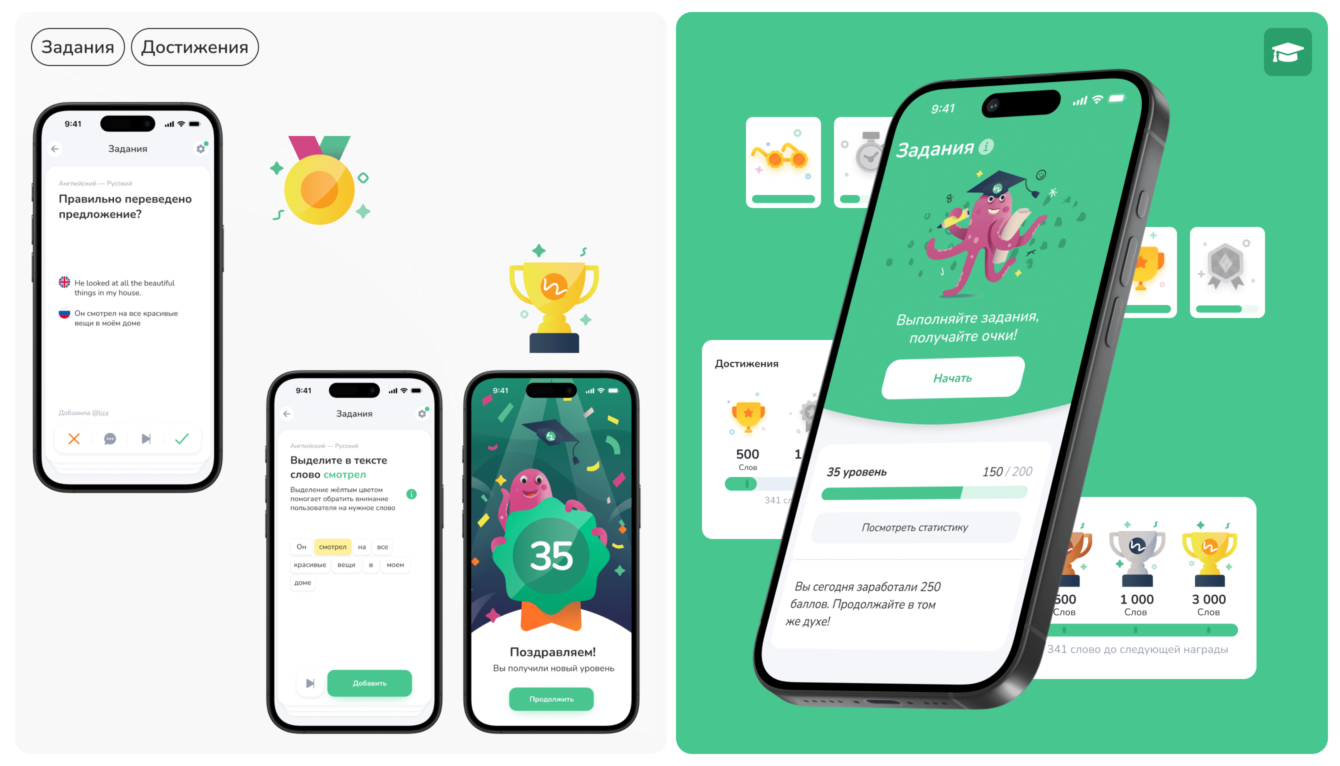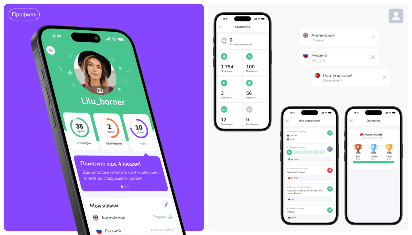 Мы разработали дизайн, который делает изучение языка увлекательным, мотивирующим и, главное — постоянным. Это не просто приложение, а личный помощник в мире иностранных слов, грамматики и общения с носителями языка — он помогает учить слова, прокачивать свой уровень и получать за это награды.