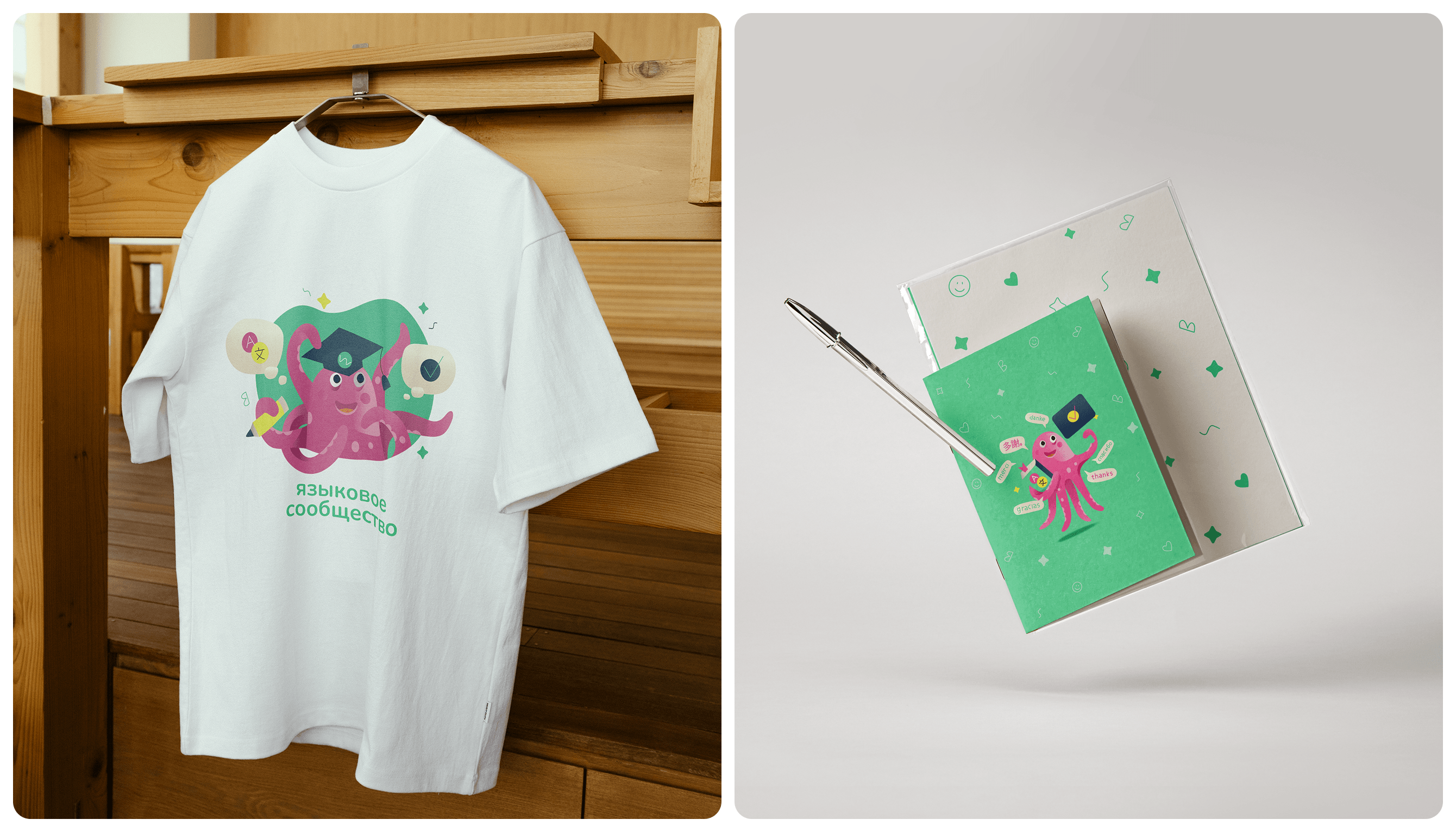 Маскот настолько полюбился команде, что мы решили «поселить» его на мерче. Теперь он украшает футболки, кружки, блокноты и другие предметы. Иллюстрации легко адаптируются под любой фон и текстуры, делая мерч стильным и универсальным.