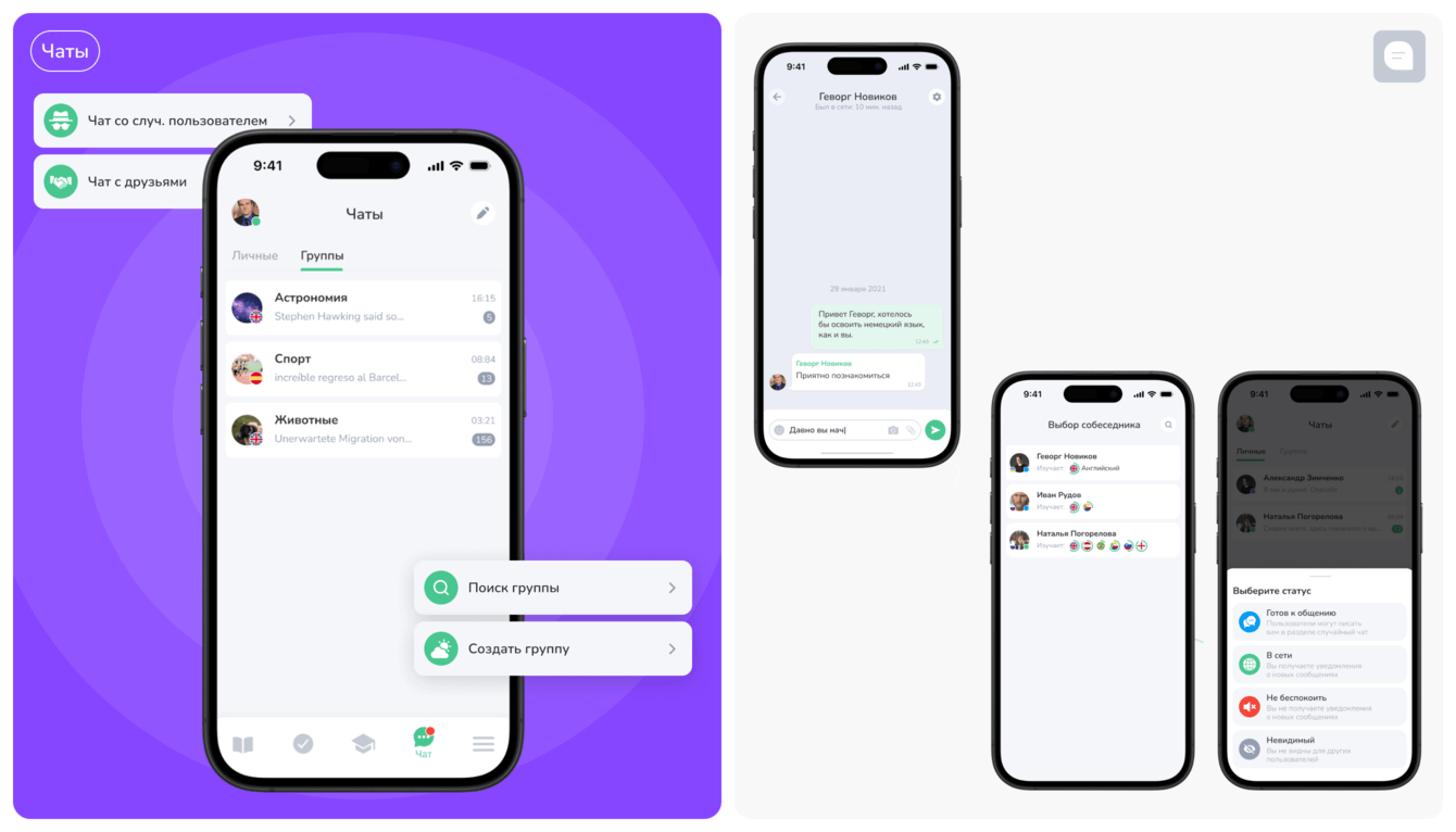 Мы тщательно проработали экраны чатов и диалогов, чтобы пользователи могли легко переписываться друг с другом или в групповых чатах.