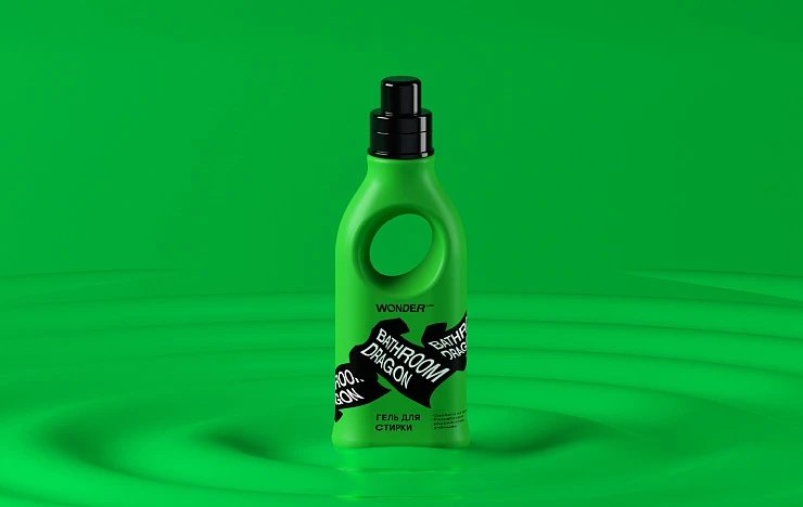 Вдохновившись идеей изобретения, нам хотелось предложить столь же оригинальный и свежий подход и к форм-фактору. Мы пробовали баночки для моющих средств и в виде очертаний овощей, и в стилистике «научных» пробирок, и даже брали кросс-категорийные формы. В итоге, фаворитом стала идея форм-фактора, где в одной из бутылок уже был заложен айдентический знак — нестандартным проёмом в центре упаковки.
