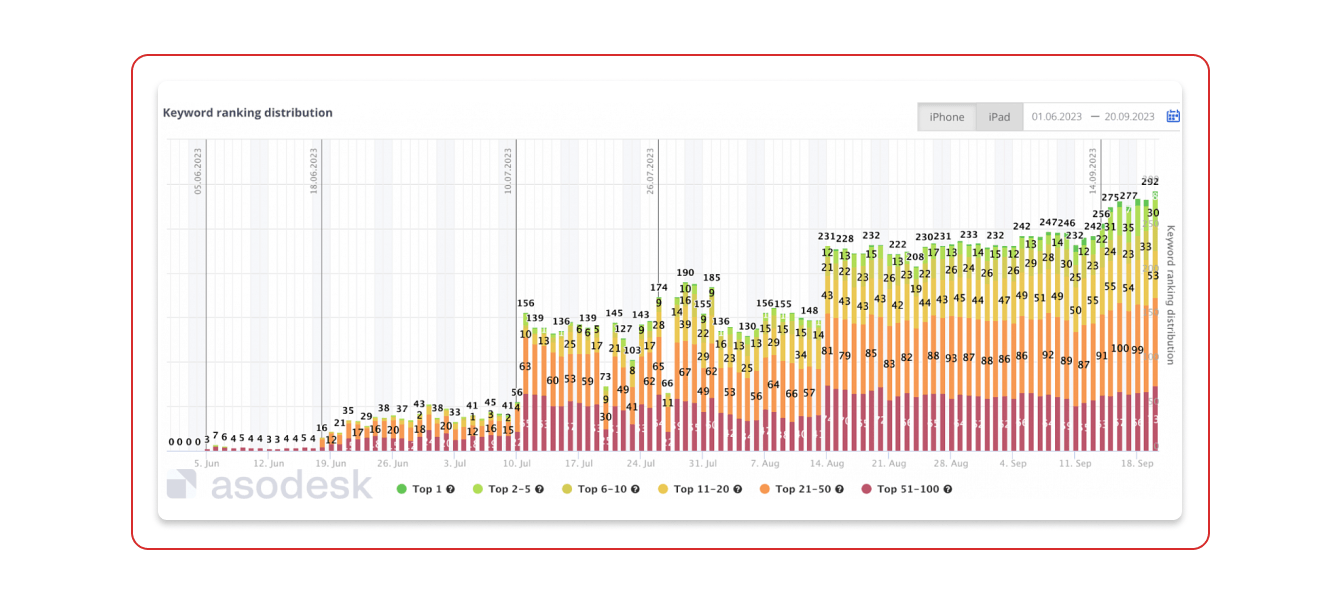 Одна из приоритетных задач на старте — нарастить объём ядра ключевых запросов. Помимо этого, важно запустить цикличную работу индексации: наращивать объёмы и максимизировать установки, оставляя только те запросы, которые приносят больше трафика в приложение. Дополнительно мы разобрали ядра конкурентов, и выделили для себя, где ещё можно усилиться.