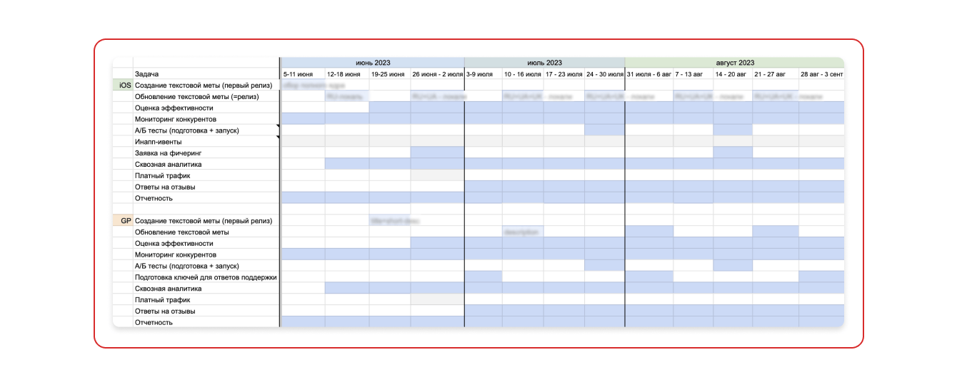 План работ мы разбили по срокам и платформам. Во время «пилота» докс помогает свериться по срокам и быстро увидеть, если что-то идёт не так.