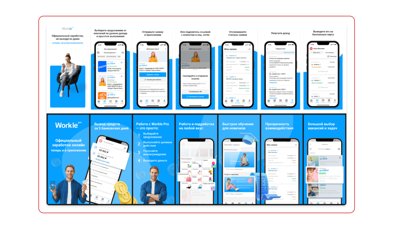 Команда дизайнеров по нашему ТЗ подготовила обновлённую графику, которая соответствует тенденциям на рынке и выделяет нас среди конкурентов. Все УТП работы с Workle Pro выделены визуально, а текста немного и он читабельный.