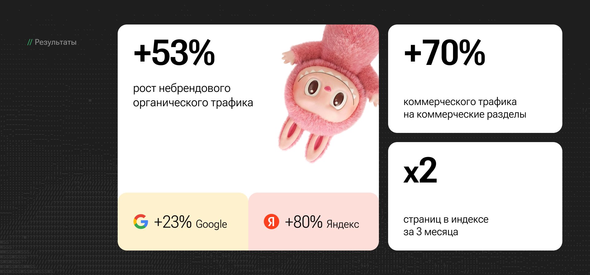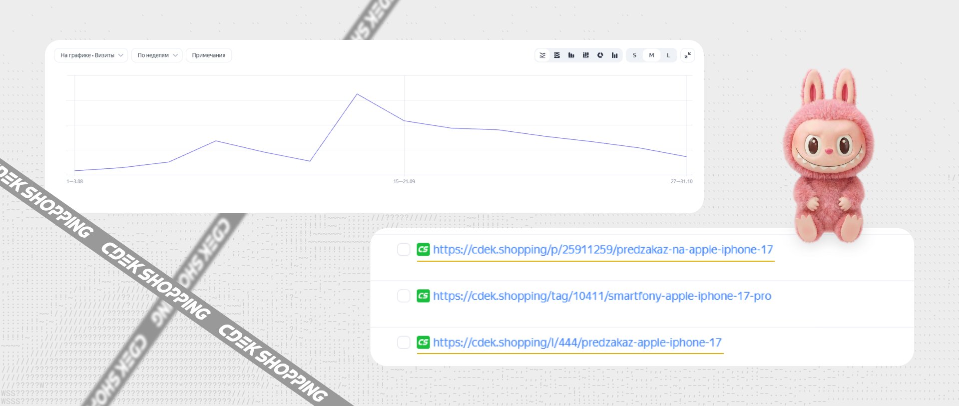 Например, мы рано успели поймать спрос на Лабубу. Команда CDEK.Shopping заметила интерес к игрушкам и пришла к нам с запросом. Мы создали теговую страницу и проиндексировали ее — страница вышла в топ-10 Google до того, как тренд стал массовым, и еще долго приносила заметный трафик и лиды.