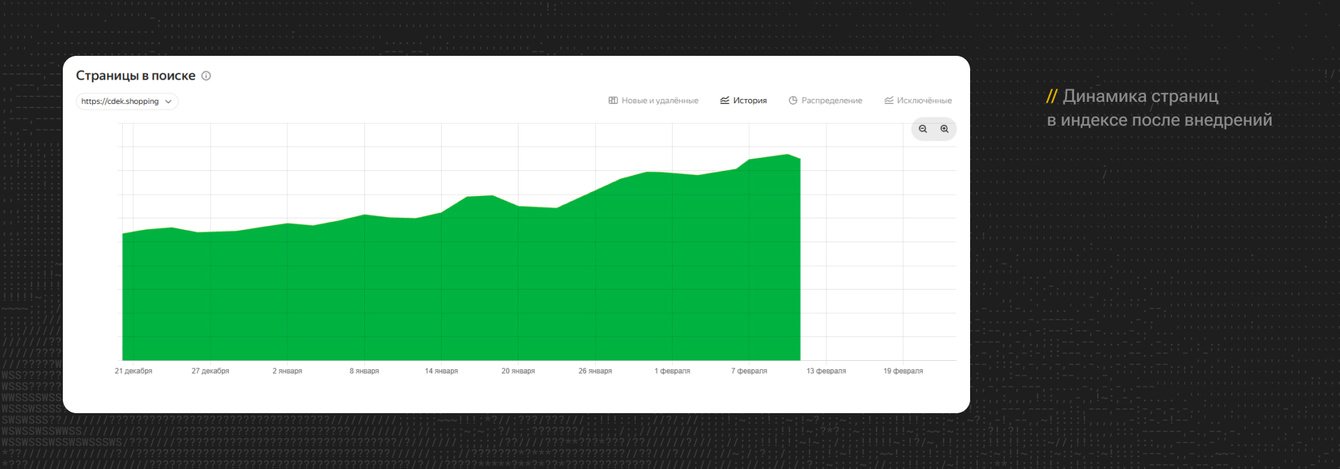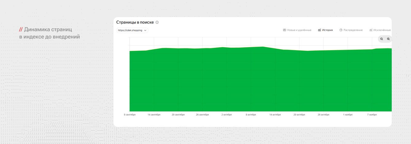 Во время аудита мы обнаружили проблемы с индексацией: часть внедрений давали эффект заметно позже, чем ожидалось. Новые категории и теговые страницы появлялись на сайте, но в поиске отражались медленно и неравномерно.
