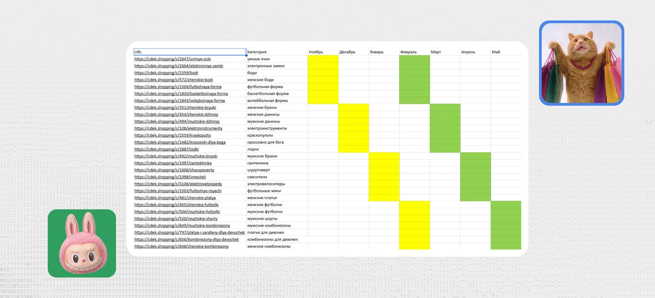 Обычно мы закладываем на проработку категорий три месяца. За это время мы собираем семантику и структуру раздела, создаем страницы, наполняем их ассортиментом и отправляем на индексацию. В результате сайт успевает занять позиции в поиске до пика спроса.