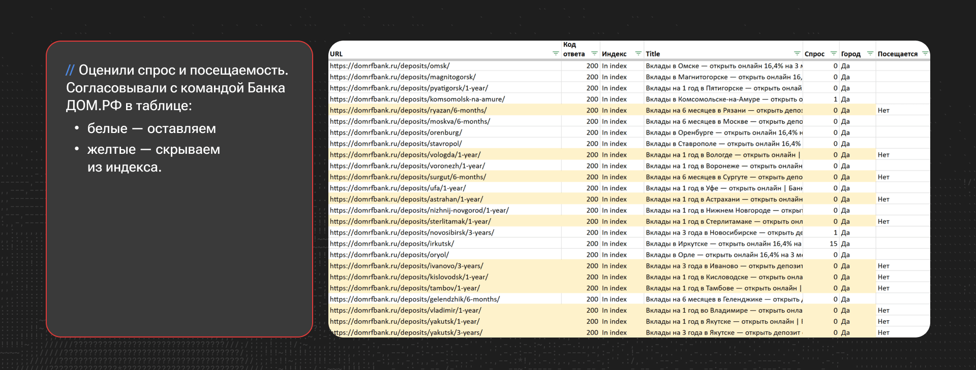 Параллельно делали обратное: искали темы, по которым спрос уже сформирован, но на сайте не было отдельных посадочных страниц. Поисковый спрос нужно было связать с продуктовыми приоритетами банка. Поэтому работали совместно: команда Банка ДОМ.РФ определяла направления, которые нужно продвигать, а мы замеряли спрос, собирали семантику и проверяли подготовленные командой Банка ДОМ.РФ шаблоны страниц.
