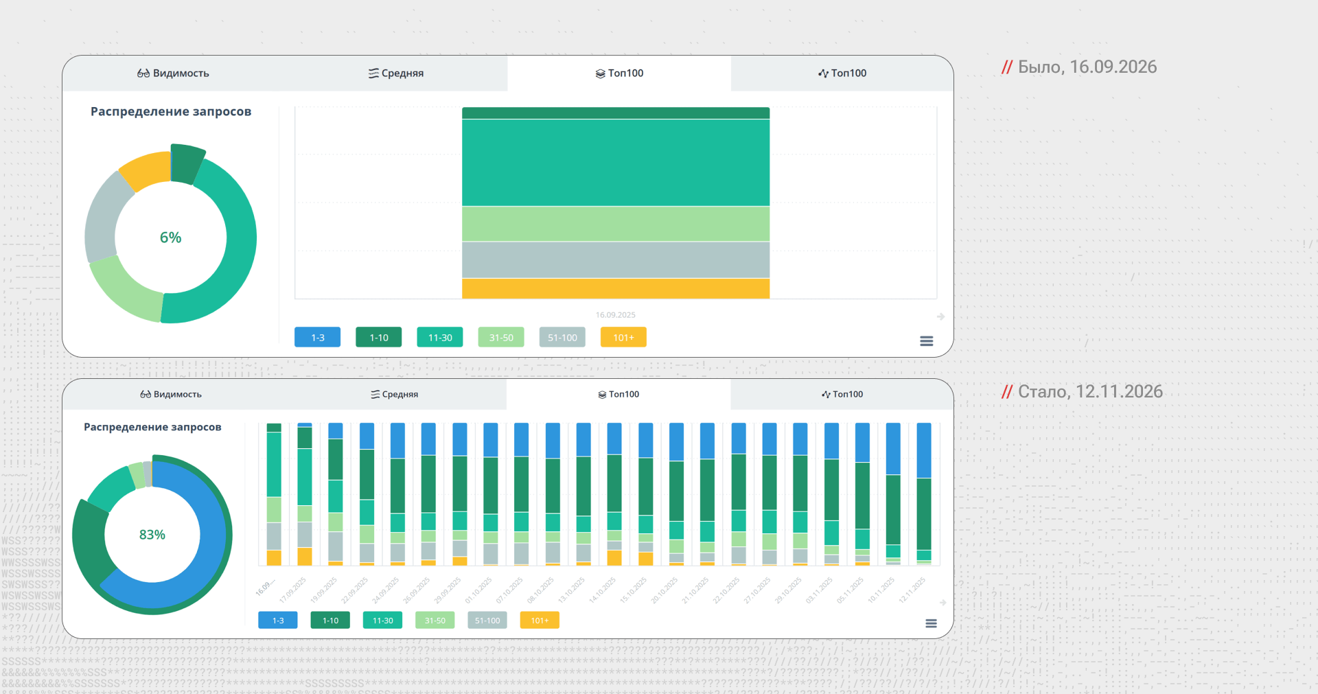 Доля запросов в топ-3 увеличилась на 63% — с 0% до 63%.