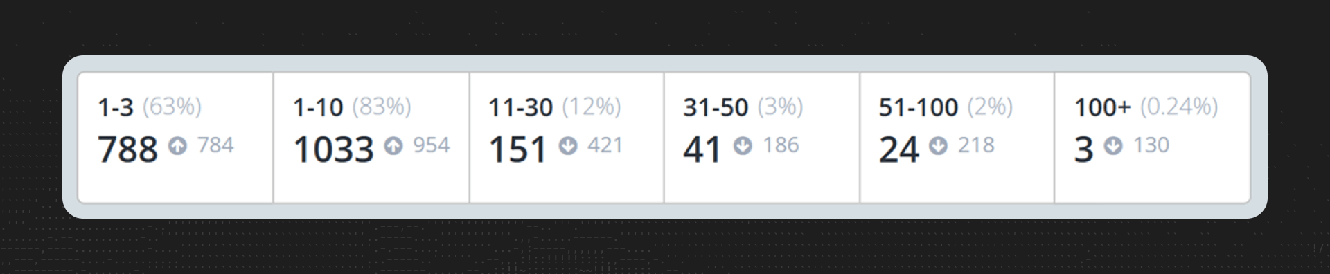 На старте в топ-3 выбранного кластера было всего несколько запросов, в топ-10 — около сотни. Основная масса спроса находилась ниже видимой зоны.