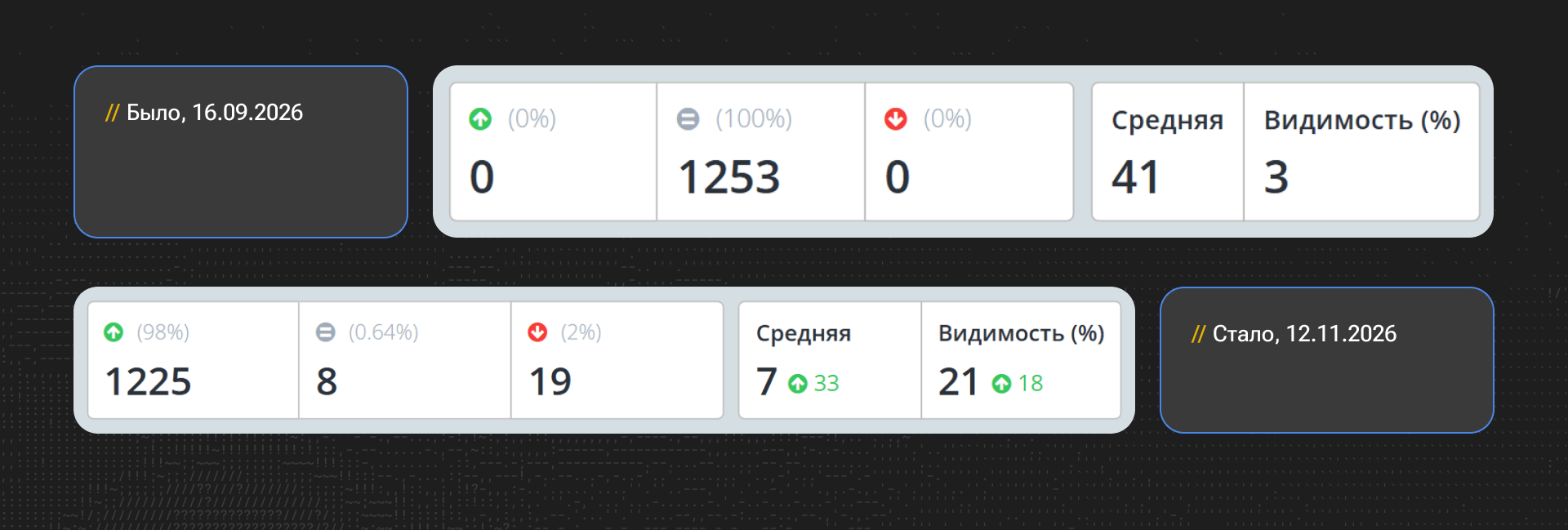 После наведения порядка структура сайта стала проще и понятнее для поисковых систем. Это дало эффект уже в течение первого месяца: средняя позиция улучшилась, а видимость по основным группам запросов начала расти.