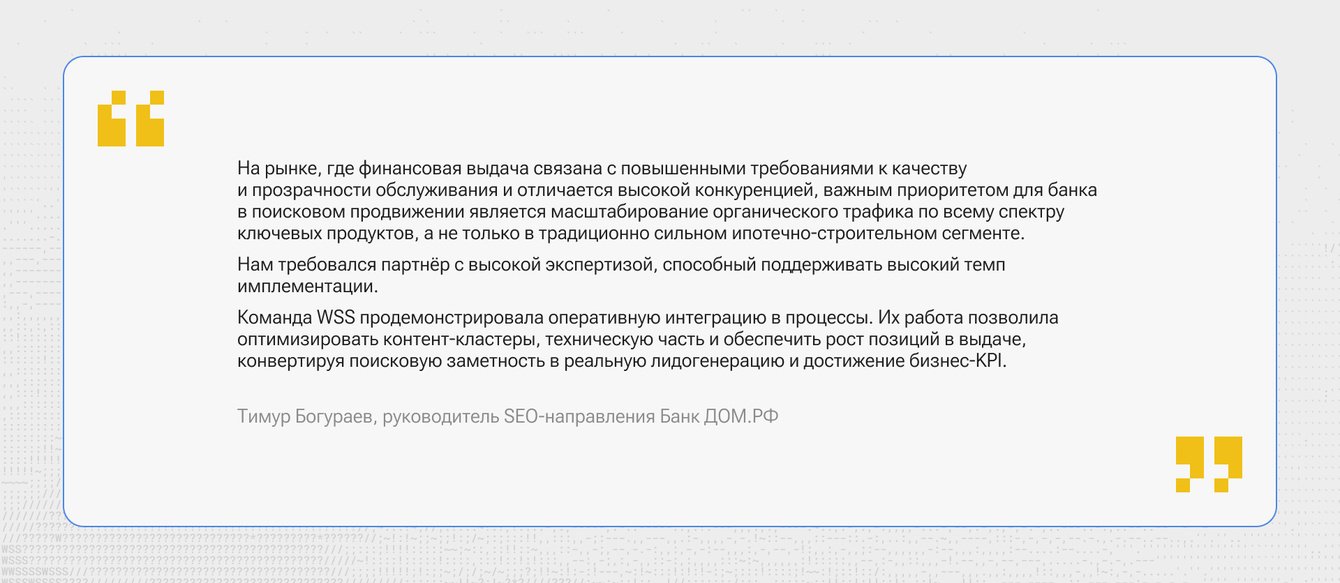 В сентябре 2025 года Банк ДОМ.РФ пришел с запросом: повысить видимость в коммерческой выдаче и подняться в топ по направлениям, которые влияют на бизнес-показатели — вклады, кредиты и другие банковские продукты. Видимость стала главным KPI проекта.