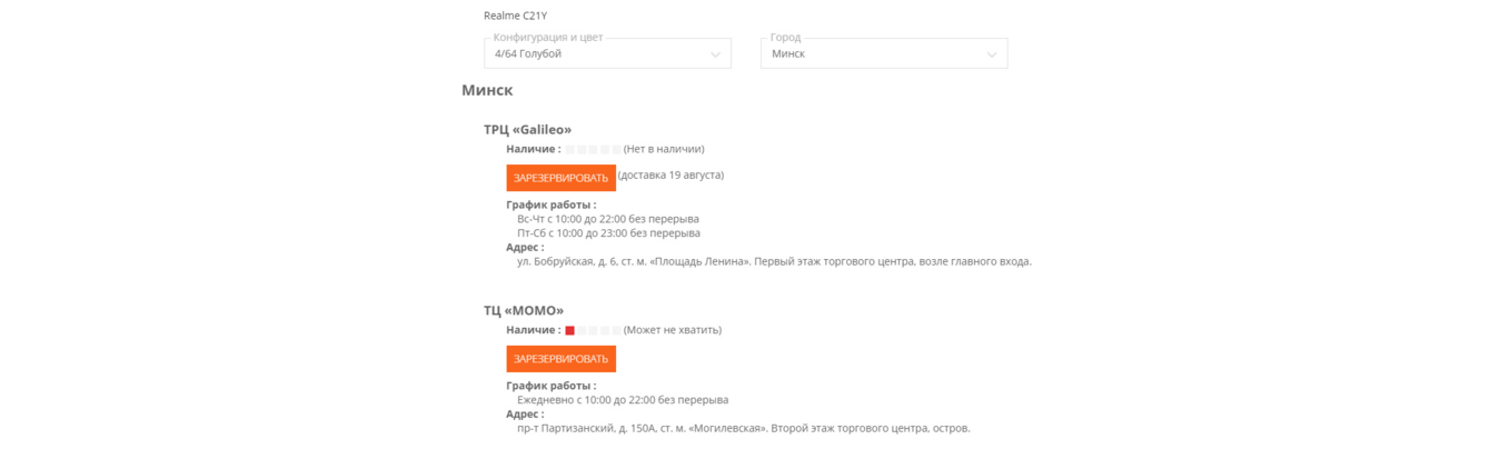 Реализована возможность зарезервировать товар в каком-либо магазине с возможностью его последующего самовывоза. В случае если товар находится на складе рассчитывается примерное время доставки до магазина или на дом. Поэтому фактически купить нужный товар можно в любой точке.