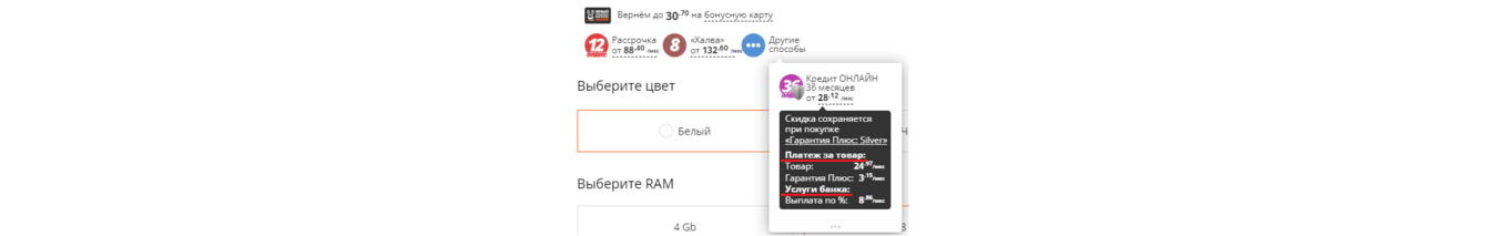 Суть работ: Одними из ключевых инструментов для управления поведением пользователя являются ярлыки. Они демонстрируют пользователю способы покупки товара, способы оплаты, размер ежемесячного платежа, если это рассрочка или кредит, а также информацию о дополнительных гарантиях и их стоимости.