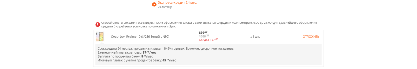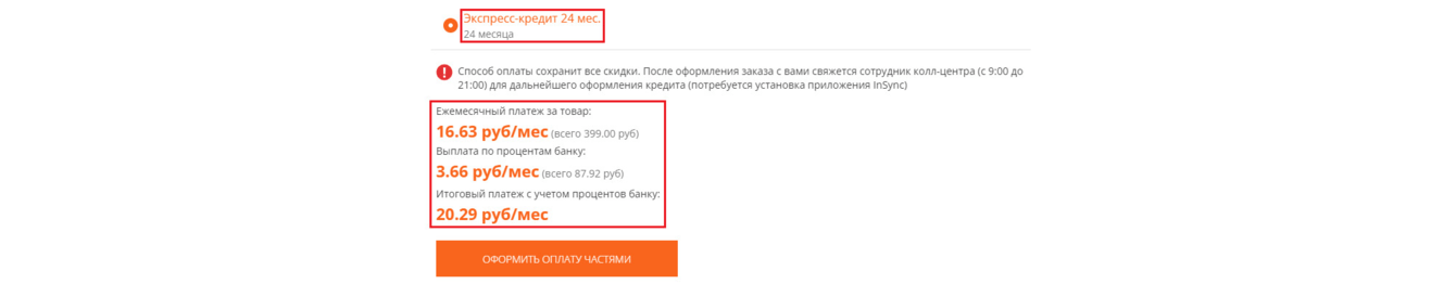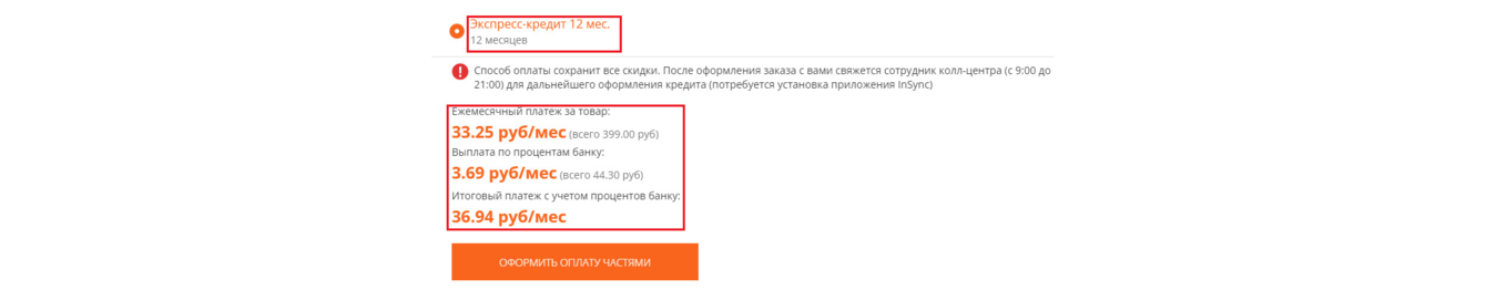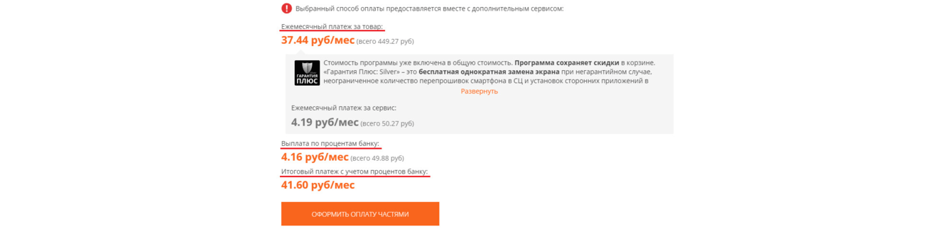 При оформлении кредита отображается ежемесячный платеж в пользу магазина и отдельно — процент банка. У многих других магазинов эта информация скрыта.