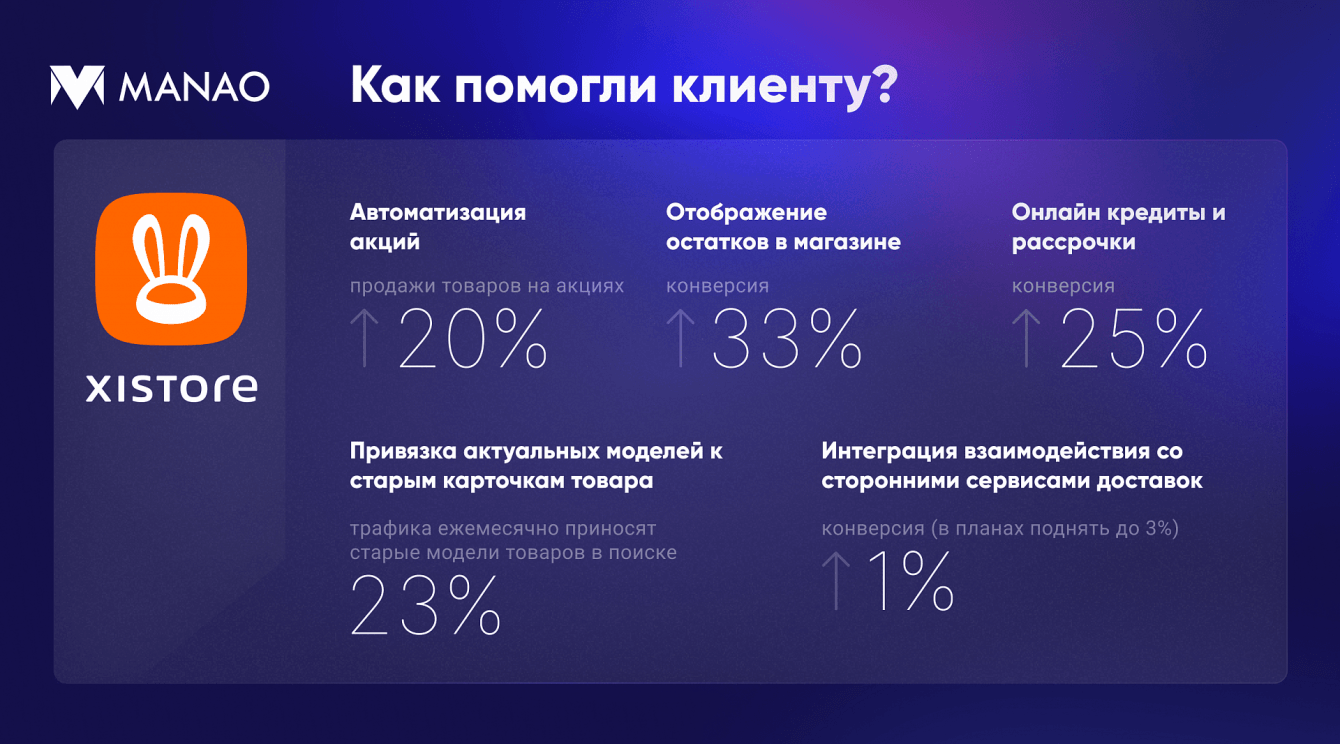 В результате плодотворного сотрудничества больше чем за 6 лет сайт Xistore.by значительно преобразился и стал куда более полезным как для пользователей, так и для сотрудников компании. Автоматизация стандартных действий, таких как добавление товаров в раздел акции, размещение ярлыков, расчет стоимости устройства в проекте трейд-ин позволяет оптимизировать ресурс специалистов и выполнять больше полезных для бизнеса задач. Внедрение нового функционала положительно отражается на конверсиях и объеме продаж. В планах продолжить сотрудничество и дальше улучшать функциональность платформы.