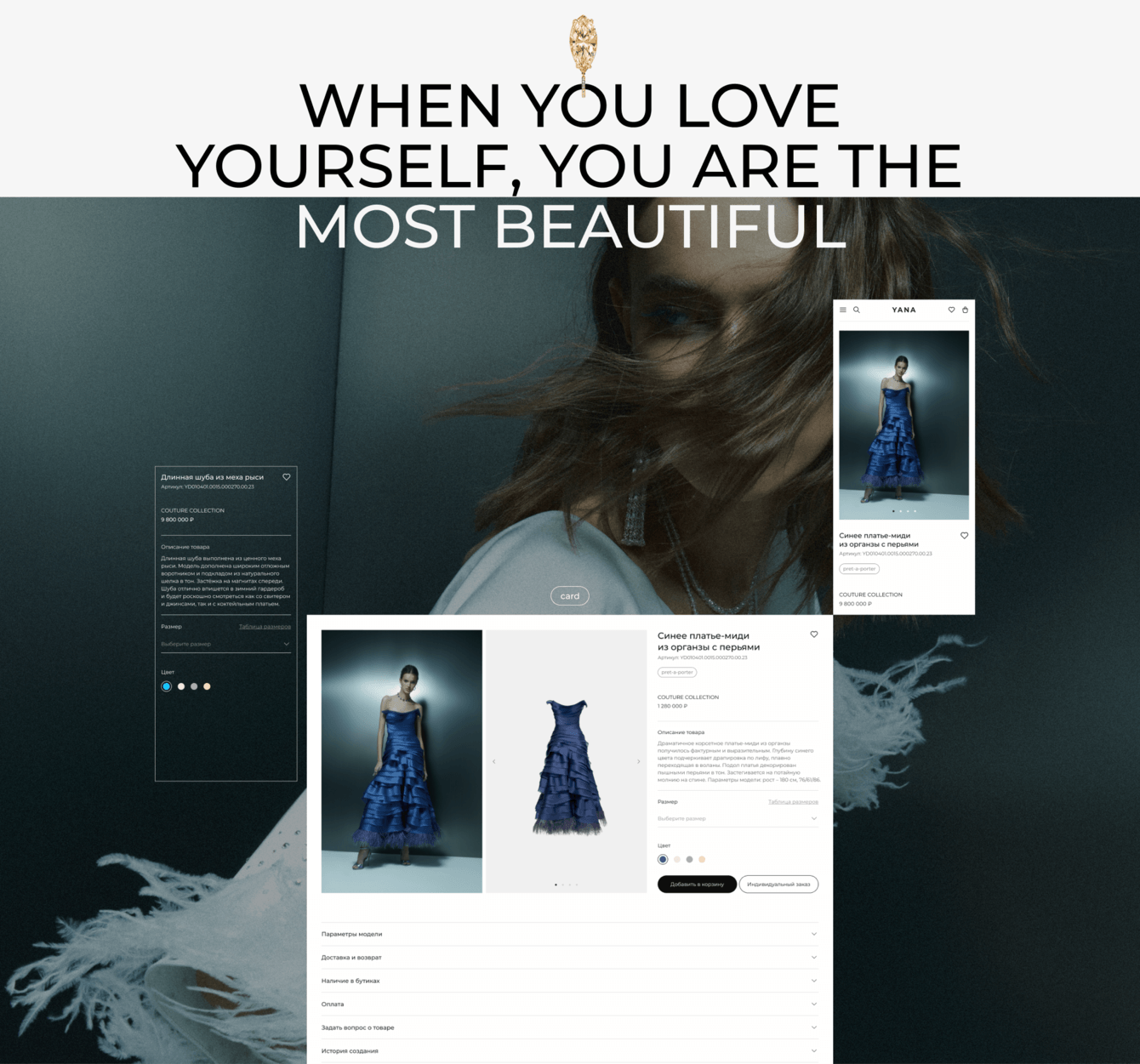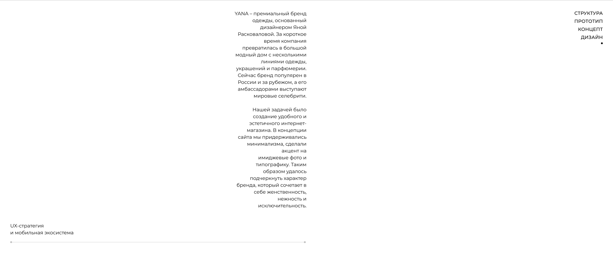 Итогом нашей работы стала единая цифровая экосистема модного дома YANA. Мы создали платформу, которая одинаково эффективно работает на имидж бренда и на рост онлайн-продаж. Продуманный UX в сочетании с премиальным визуальным языком позволил бренду укрепить свои позиции на российском и зарубежном рынках.