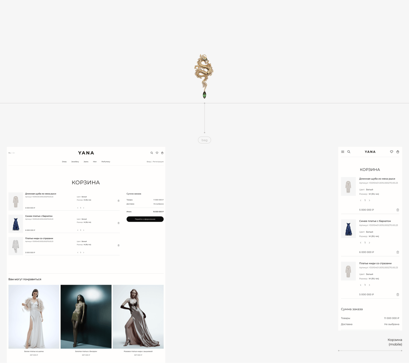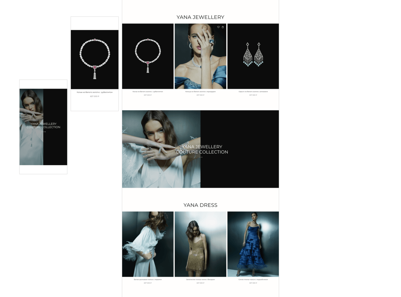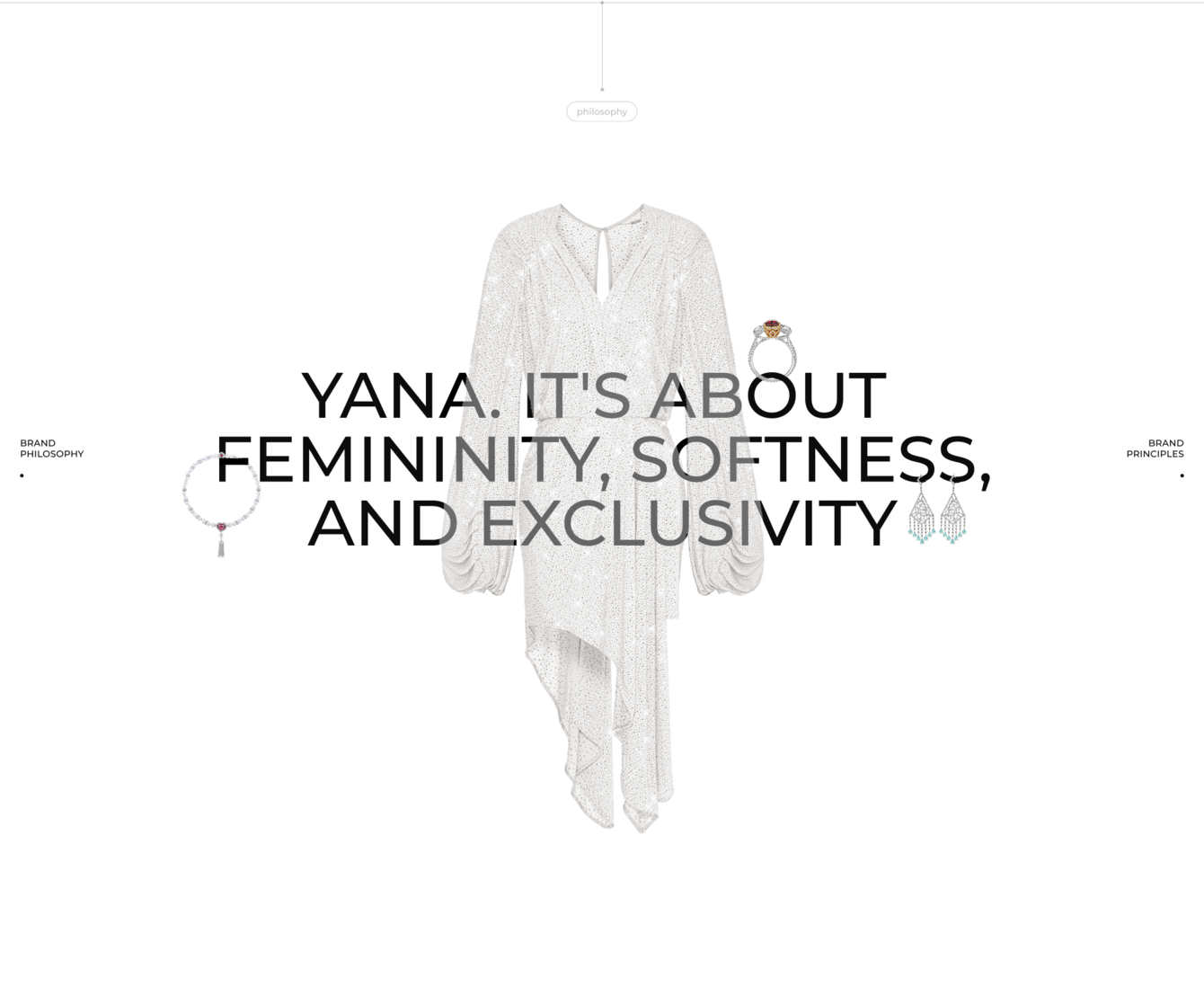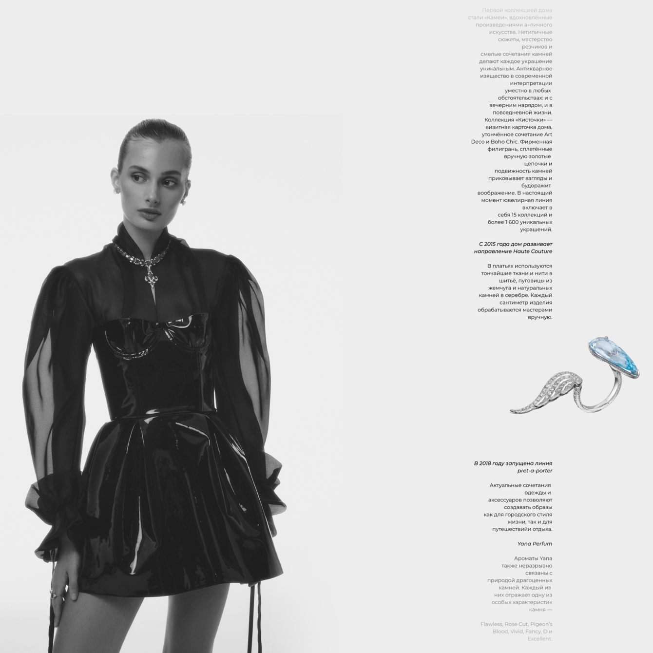 YANA — бренд Яны Расковаловой, выросший в модный дом с линиями одежды, ювелирных украшений и парфюмерии. Нам нужно было разработать эстетичный интернет-магазин, который соответствует мировому статусу бренда. Основная цель: создать удобный инструмент для онлайн-продаж, сохранив люксовый статус бренда.