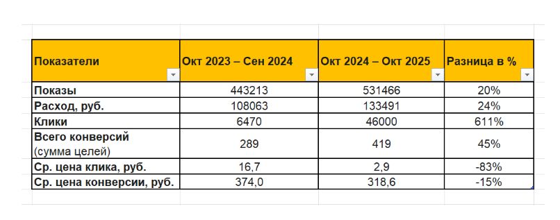 - Увеличение кликов: благодаря снижению CPC, количество кликов выросло на 611% (в 7 раз!), что обеспечило объем трафика для достижения целевых показателей по конверсиям.