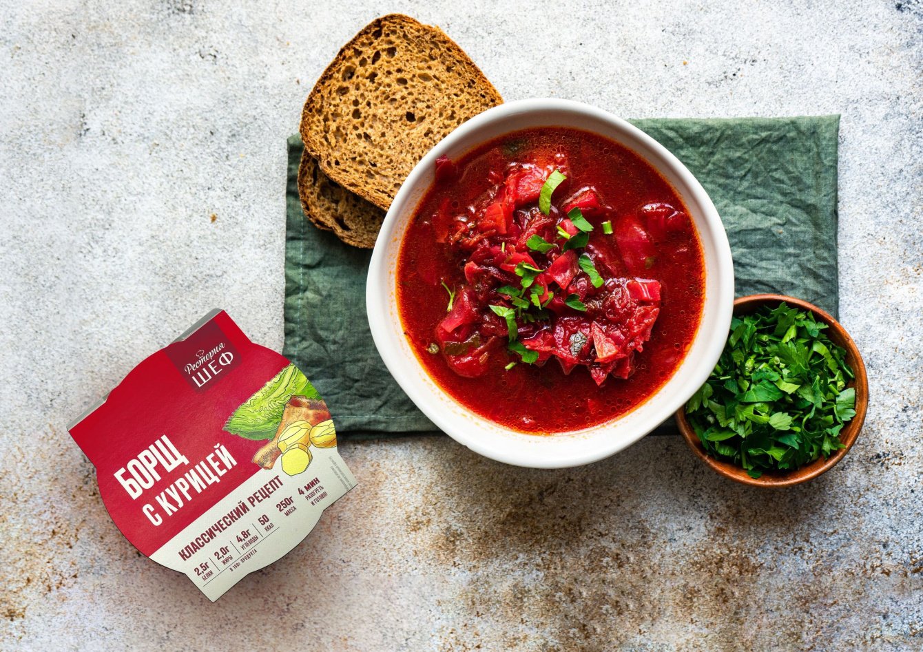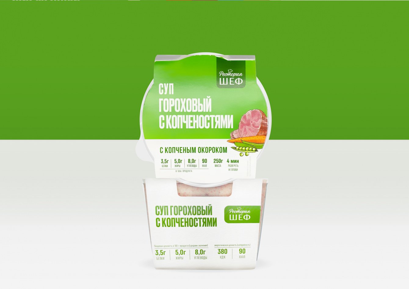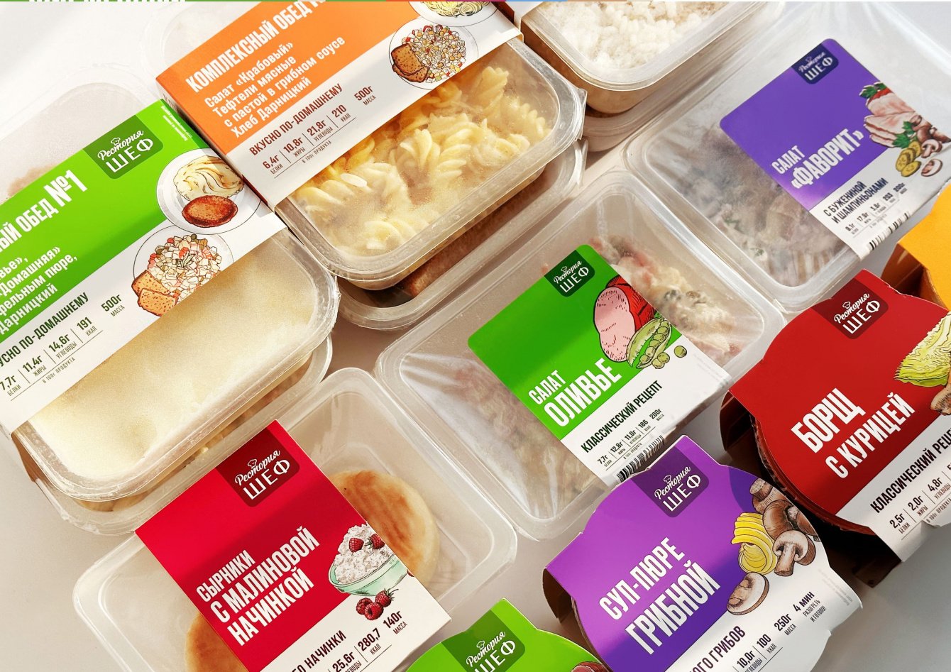 «Рестория Шеф» уже был представлен на полках «Пятёрочки» несколько лет. Однако после исследования выяснилось, что внешний вид упаковки всех товаров «Рестории Шеф» не слишком ярко выражает основные их качества – вкус, свежесть и удобство. Проще говоря, он оказался слишком нейтральный. И хотя бренд создавал общее впечатление тепла, уюта, домашней обстановки и меню в семейном ресторанчике, ему не хватало как эмоций, так и читаемости.