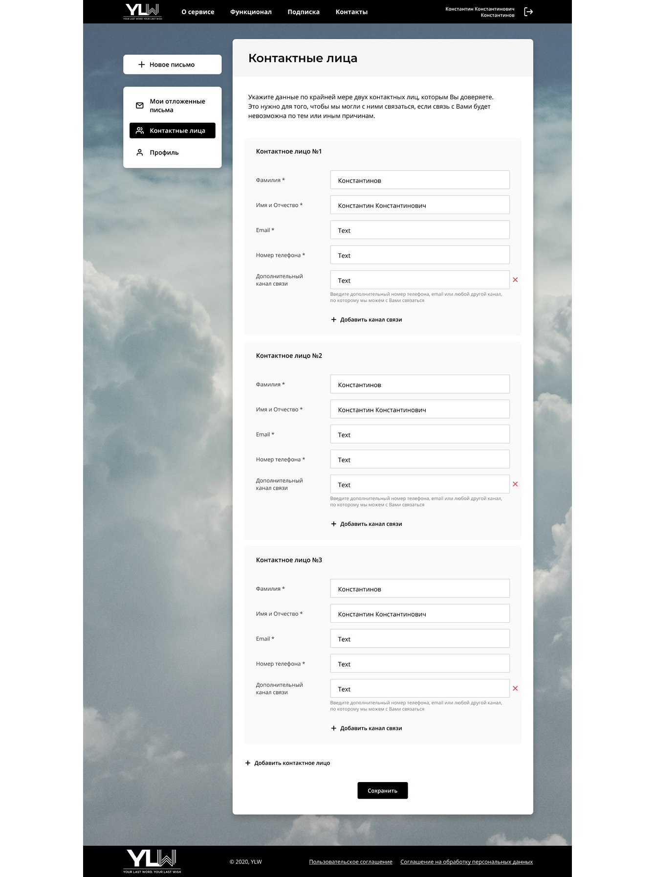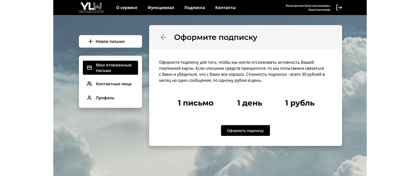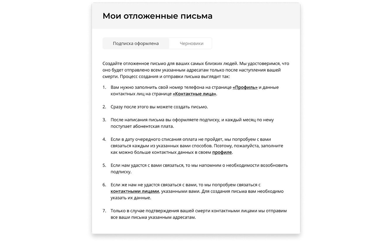 Когда пользователь оформляет подписку, ежемесячно по ней поступает абонентская плата. Если в дату очередного списания оплата не пройдет, то администратор сначала свяжется несколько раз с самим отправителем, если не получилось — с контактными лицами, которые указал подписчик. Поэтому важно заполнить как можно больше контактных данных. Только в случае подтверждения смерти пользователя контактными лицами, письма будут отправлены указанным адресатам.