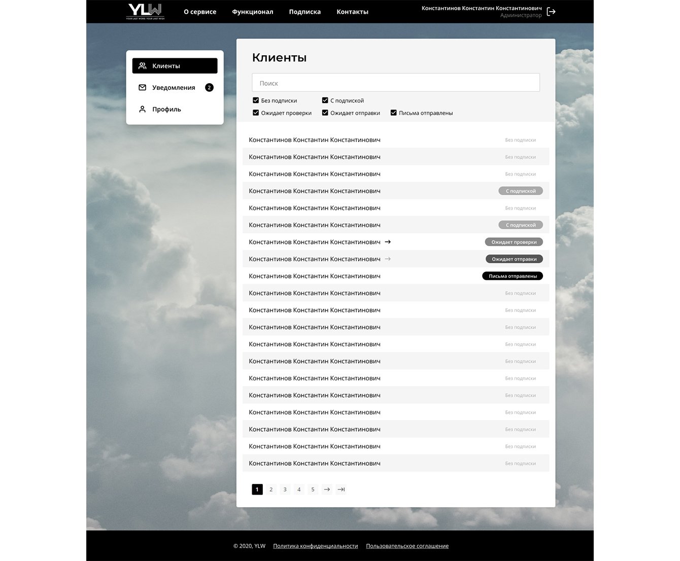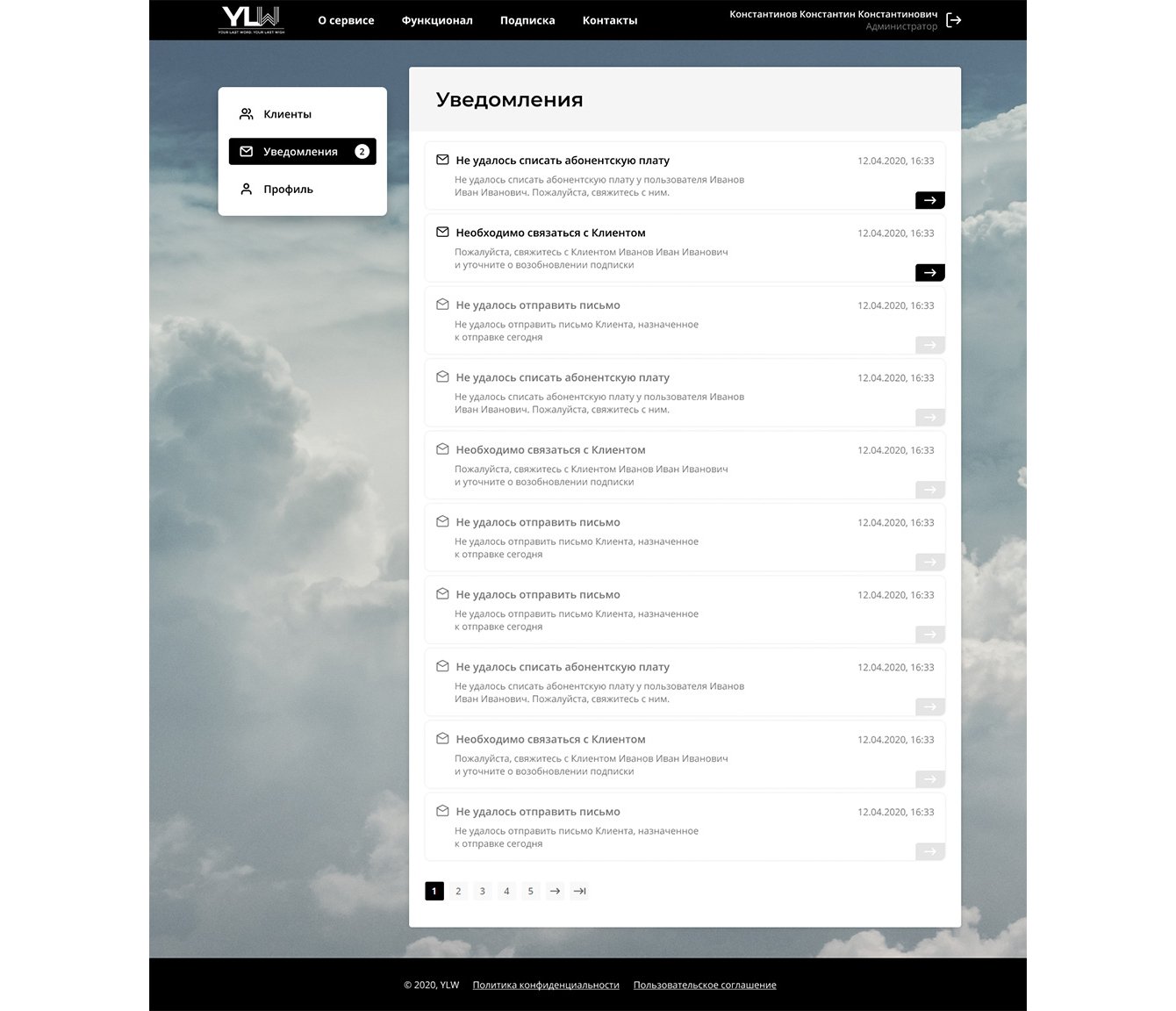 Администратор в своем кабинете может управлять клиентами, их подписками и отслеживать уведомления.