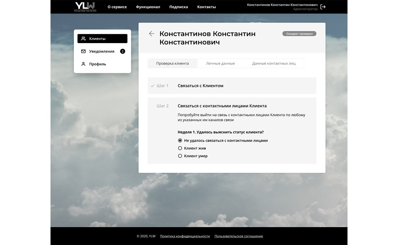 Когда 8 недель заканчиваются, а статус клиента остается невыясненным, сервис предложит отменить подписку. Если администратор указывает, что «Клиент жив», проверка заканчивается. Тогда он может снова предпринять попытку связаться с пользователем. Также появляется возможность отменить подписку, так как не удалось списать абонентскую плату. При выборе варианта «Клиент умер» осуществляется переход к Шагу 3.