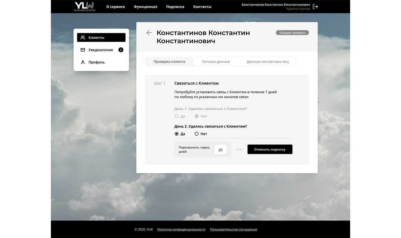 В течении 7 дней администратор пытается связаться с клиентом и указывает каждый день с помощью кнопок «Да» и «Нет» результат. Если связаться на протяжении всего времени не получилось, происходит переход ко второму шагу.