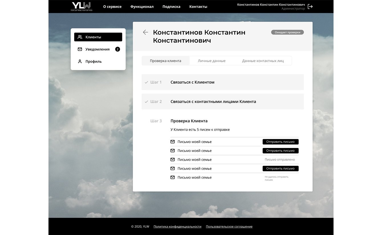 Перед нами стояла задача создать веб-приложение для отправки отложенных писем, которые адресат получает после смерти отправителя. Нужно было сделать личный кабинет, где пользователь будет создавать сообщения или видеообращения и выбирать получателей. Также должен быть кабинет администратора, где можно отслеживать поступающие оплаты и управлять рассылкой писем: в кабинете сделаны специальные шаги проверки, чтобы решение об отправке не было субъективным.