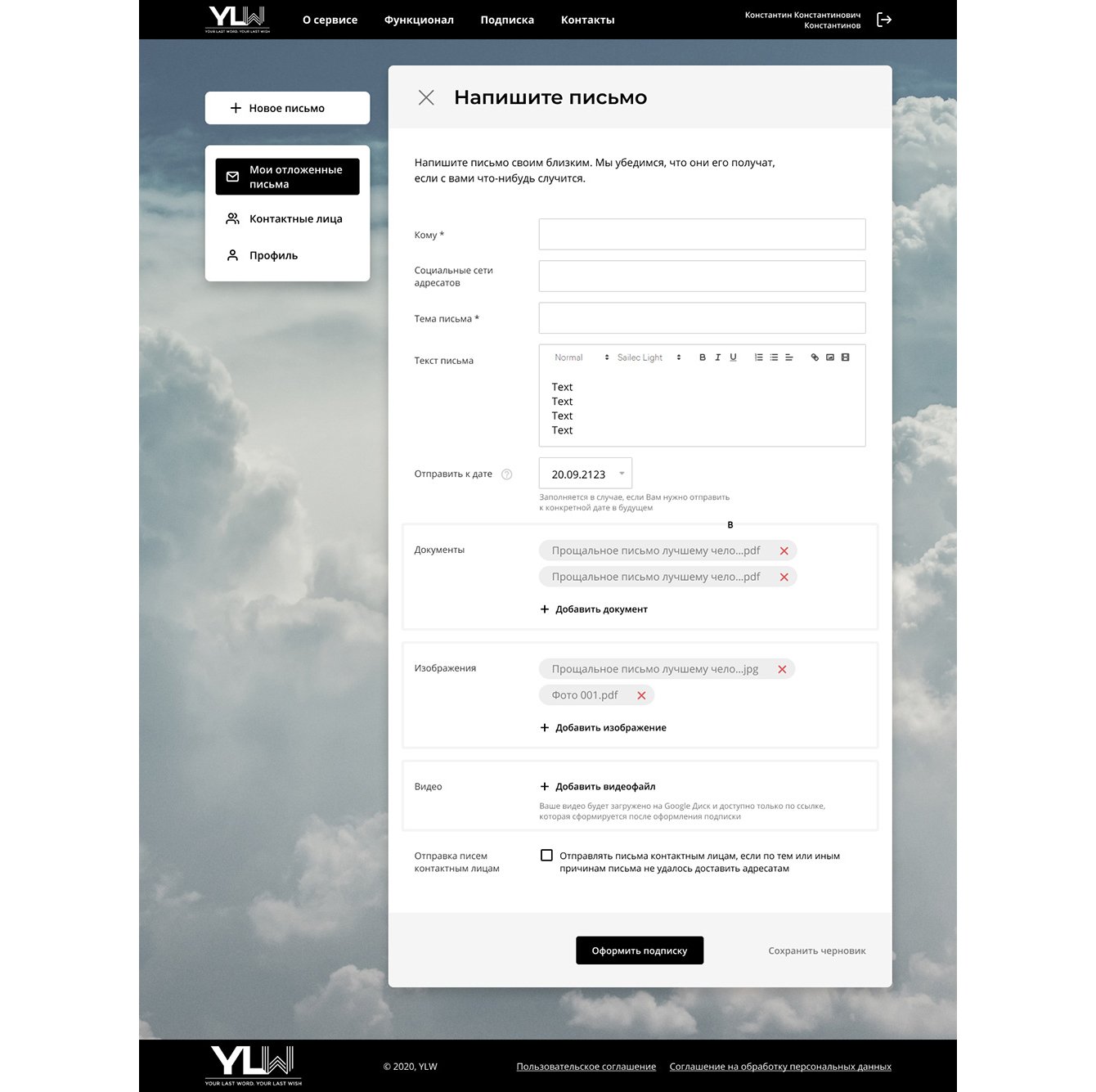 Пользователь заполняет текст послания, может прикрепить документы, фото и видео. Указывает контакты получателя. Если нужно выслать письмо к определенной дате — указывает ее. Далее переходит к оплате подписки.