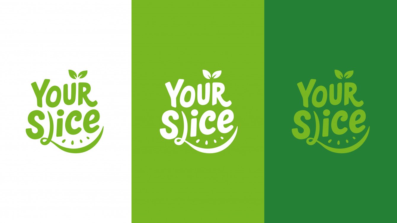 ● Логотип Your Slice с декоративным элементом в виде улыбки отразил открытость и искренность бренда. Два фирменных цвета — белый и жёлто-зелёный — сделали логотип простым и универсальным в использовании.