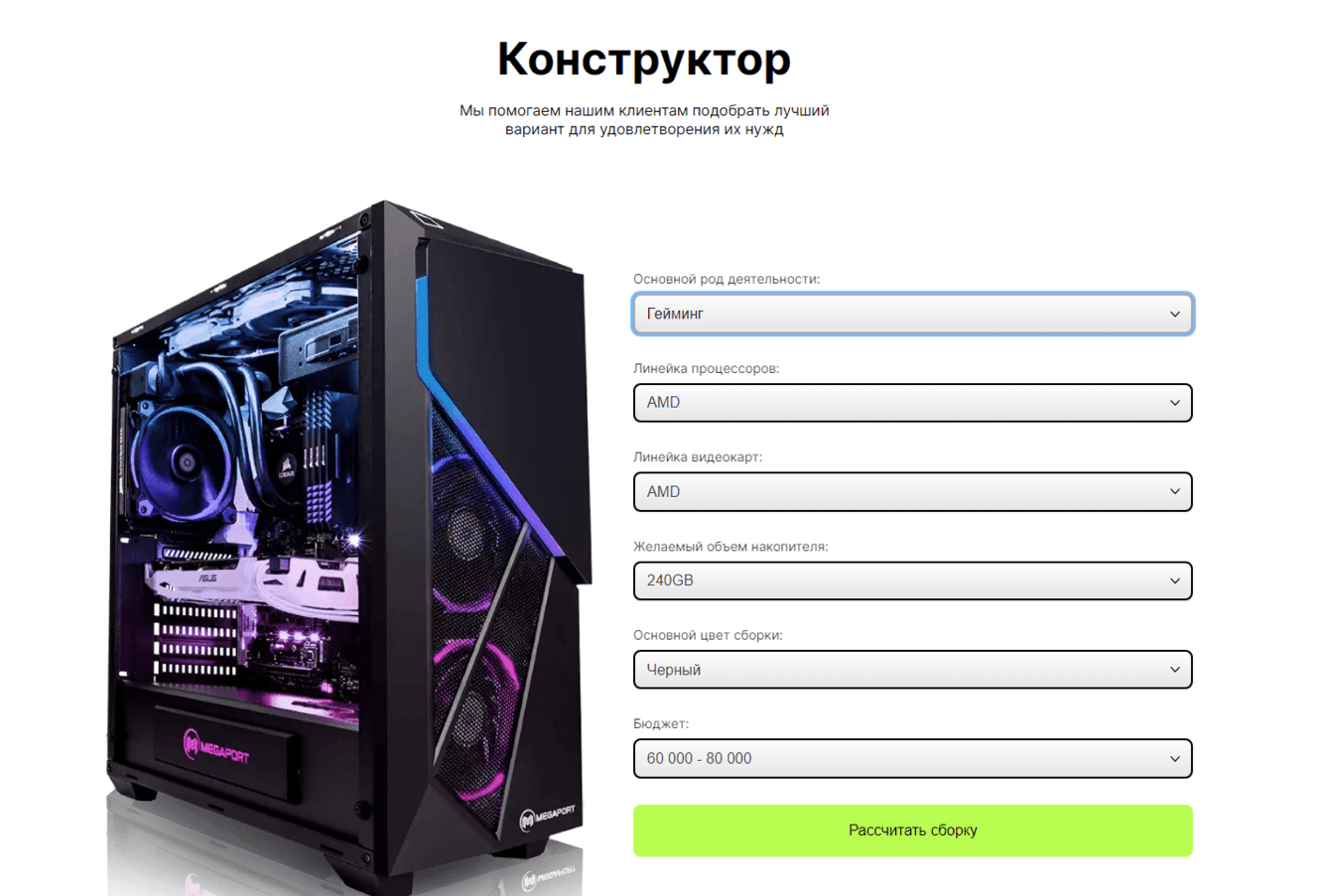 Конфигуратор компьютеров: На сайте должен быть интерактивный конфигуратор, который позволит пользователям подобрать комплектующие под свои нужды и узнать итоговую стоимость сборки.