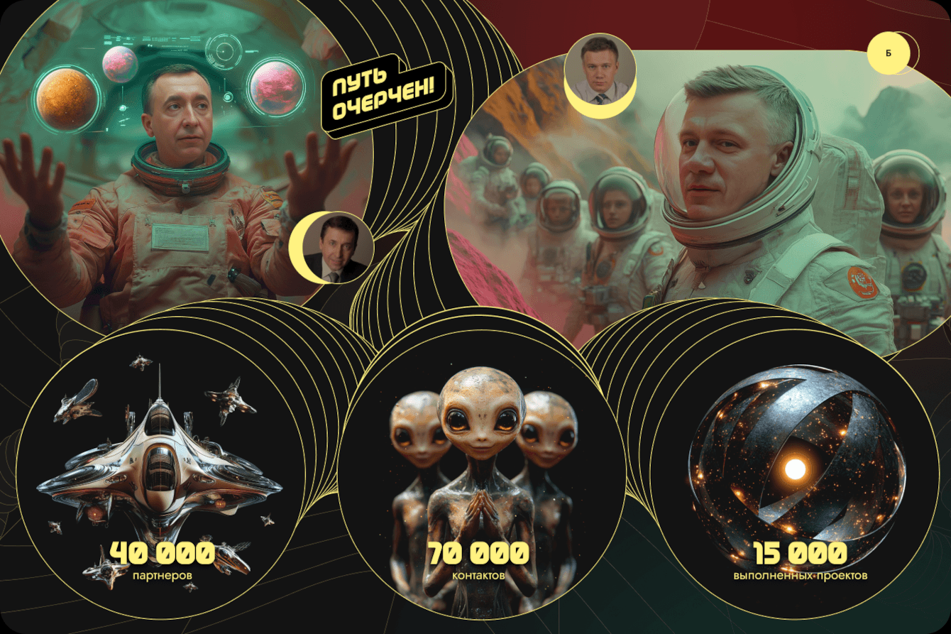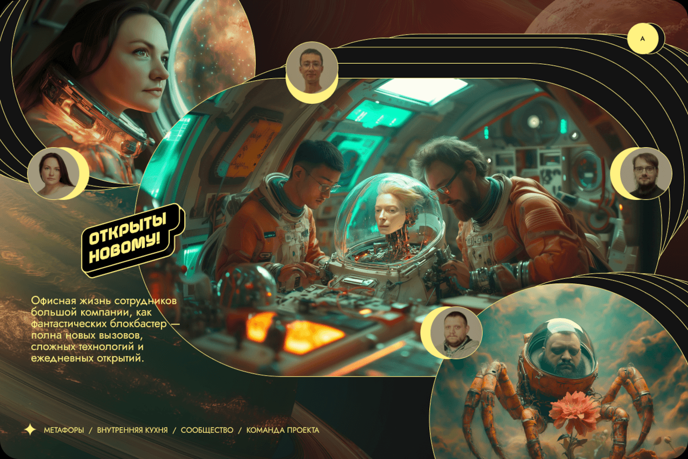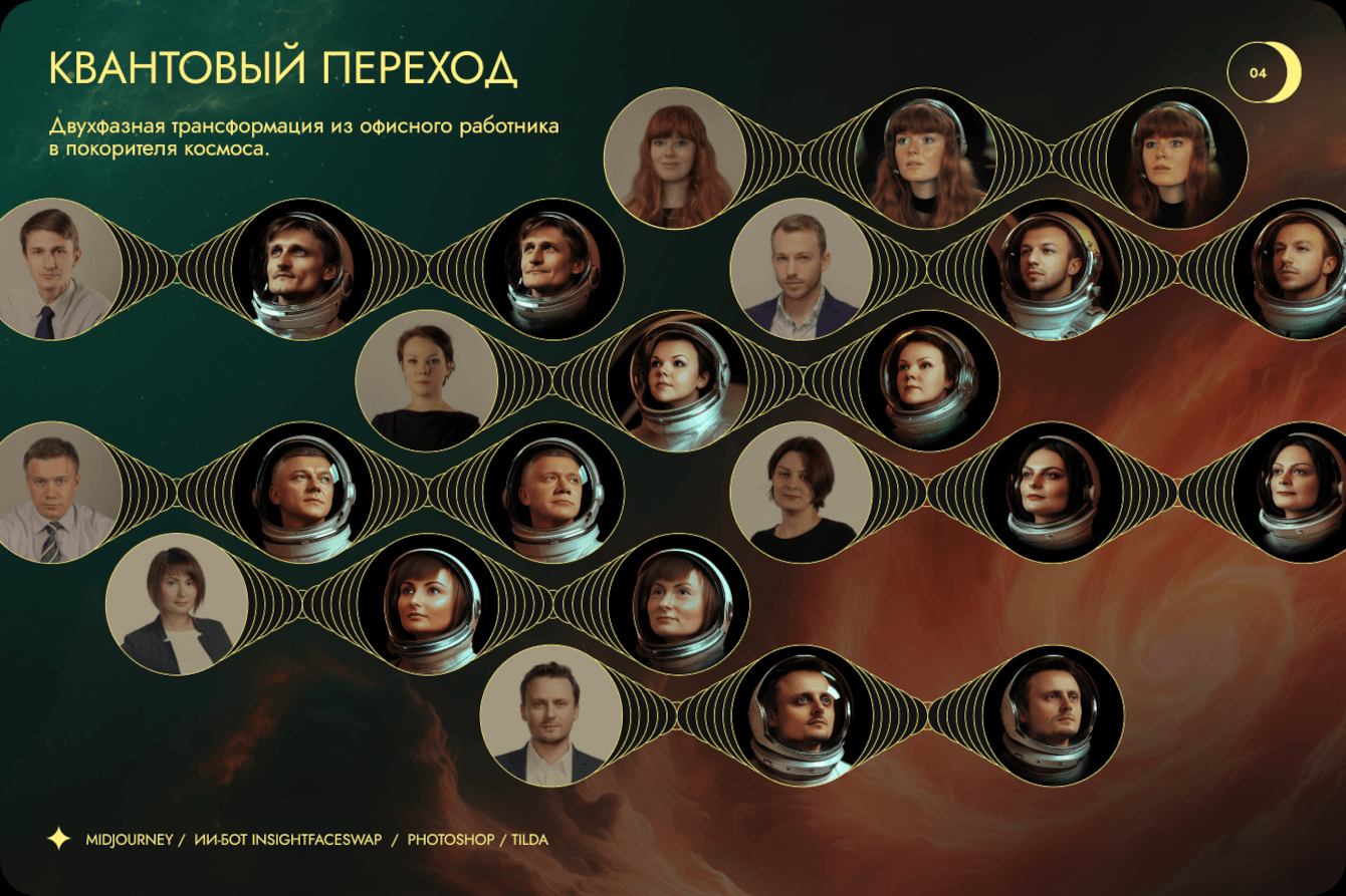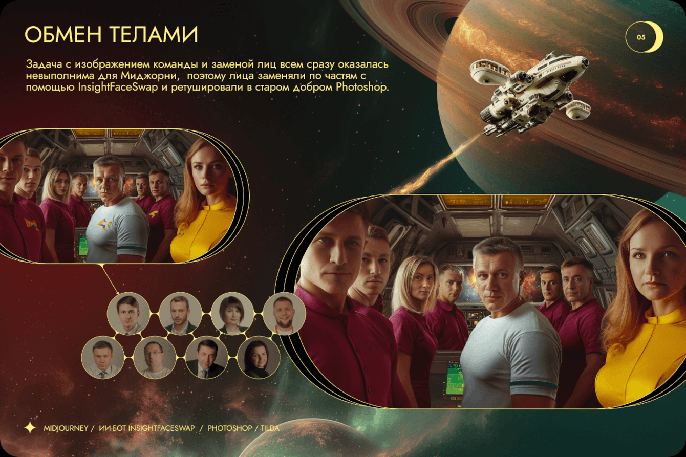 • С помощью ИИ-бота наложили на них реальные фото сотрудников из корпоративного портала. ИИ-бот InsightFaceSwap действительно творил чудеса и очень правдоподобно менял лица коллег, превращая то в штурмана корабля, то в переводчика с межгалактических языков.