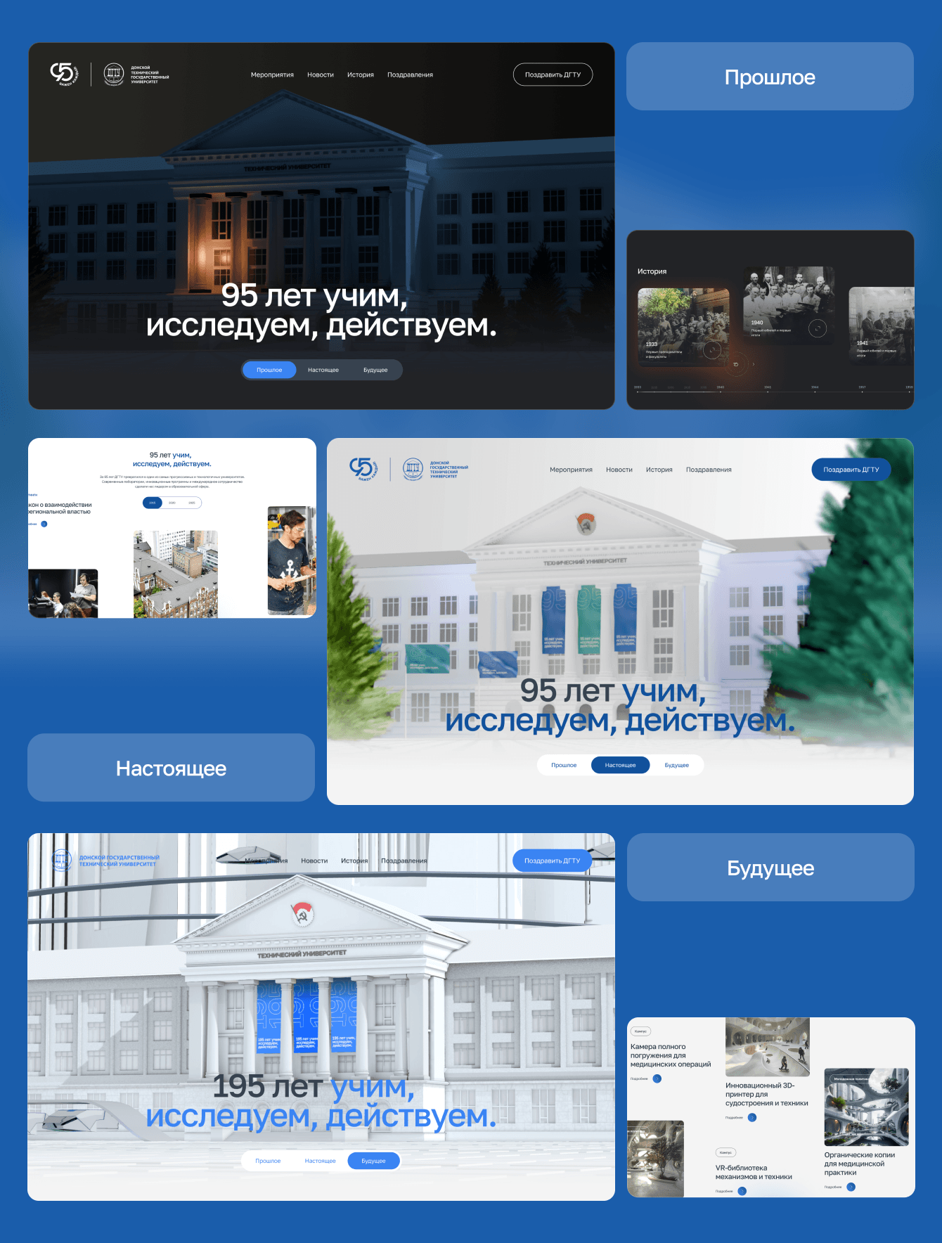Ключевая идея сайта — показать ДГТУ как развивающийся научно-образовательный центр через три временных пласта: прошлое, настоящее и будущее. Каждая из секций выполнена в уникальном визуальном стиле, отражая соответствующую эпоху.
