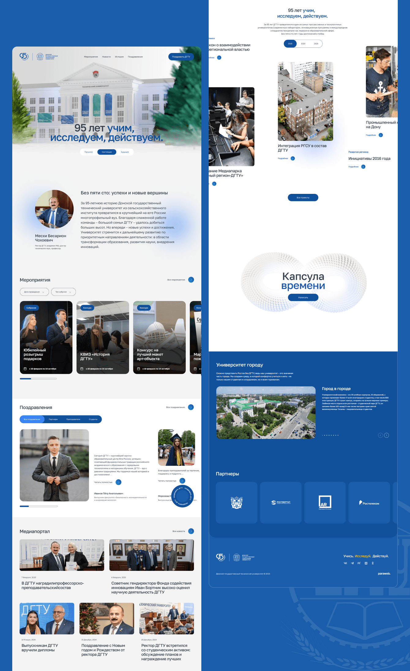 В отдельном блоке публикуется информация о выдающихся проектах вуза по десятилетиям. Актуальные новости университета загружаются автоматически из Медиапортала ДГТУ, который мы создали еще в прошлом году во время работы над основным сайтом.