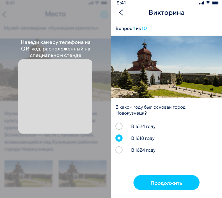 Специально для проекта на объектах квеста установили брендированные стенды с QR-кодами, которые открывают викторину. Мы добавили считыватель QR-кодов в приложение, чтобы участники могли перейти к вопросам. С помощью приложения школьники считывают код и запускают тест.