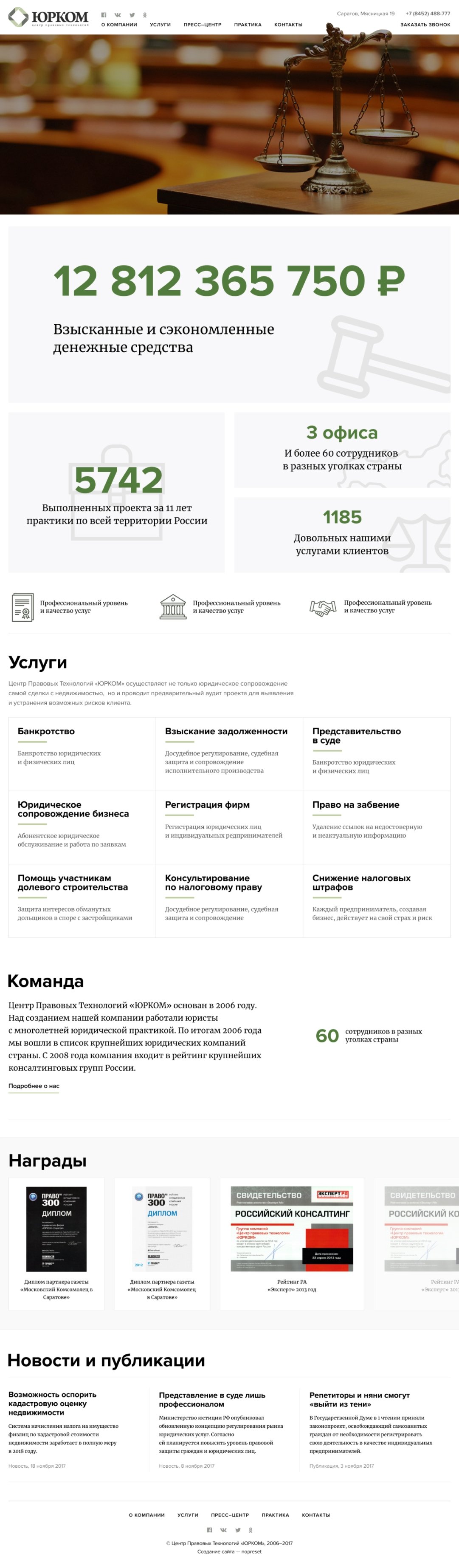 Оставили основной мотив подачи преимуществ через большие цифры, категории услуг, награды и новости.