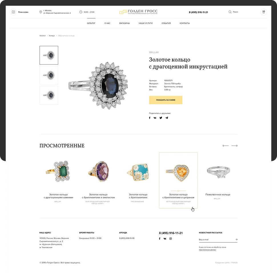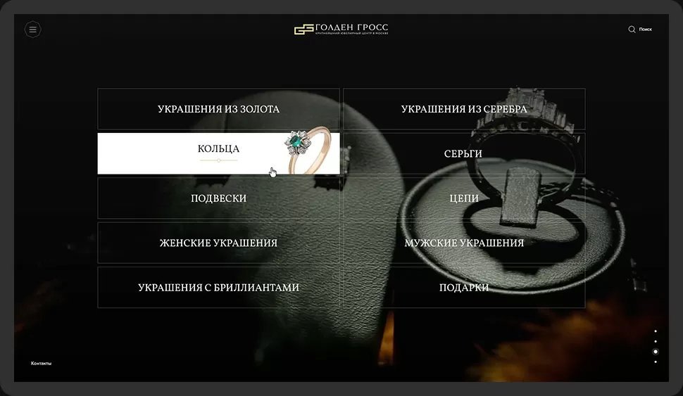 Был создан удобный поиск по всему сайту. В каталоге товаров реализован фильтр, позволяющий отфильтровать представленные товары по виду украшения, типу металла, вставке и другим параметрам. Перейти в нужный раздел каталога можно с помощью удобного меню или через главную страницу. В последнем варианте каждая категория была подкреплена иконкой, которая иллюстрирует её содержание. В карточке товара клик по кнопке «показать по схеме» переносит на план-схему ТЦ, где нужный магазин будет выделен цветом.