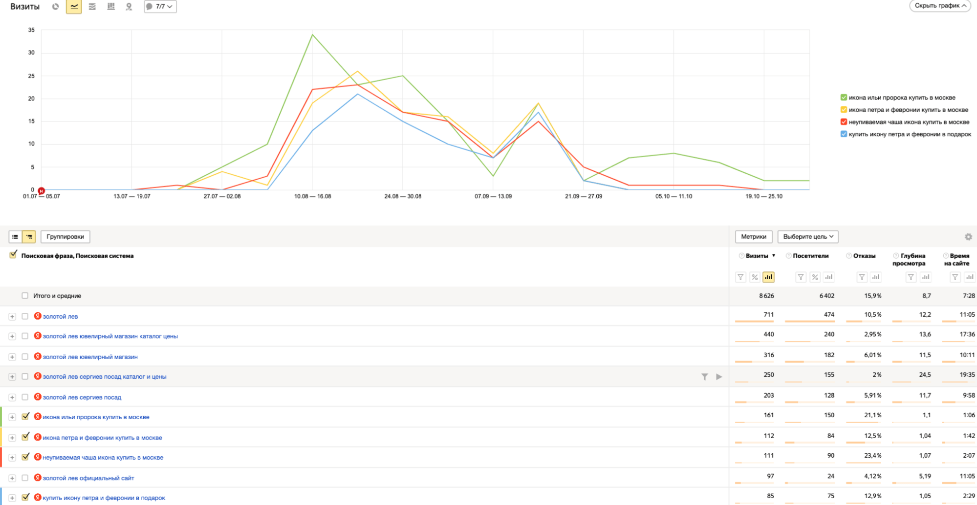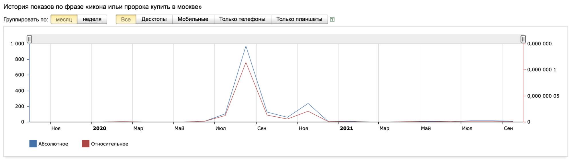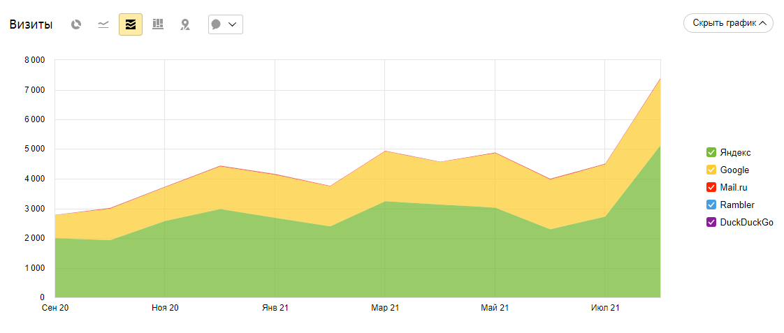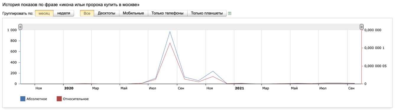 Затем была просмотрена история Wordstat, где обнаружился повышенный рост частотности ключей как раз до того момента, когда на сайт стали выполняться переходы. А это 100% накрутка, причем достаточно низкокачественная. Такое решение могло привести к санкционным решениям. Таким образом, клиент попрощался с предыдущим недобросовестным исполнителем, и мы приступили к совместной продуктивной работе.