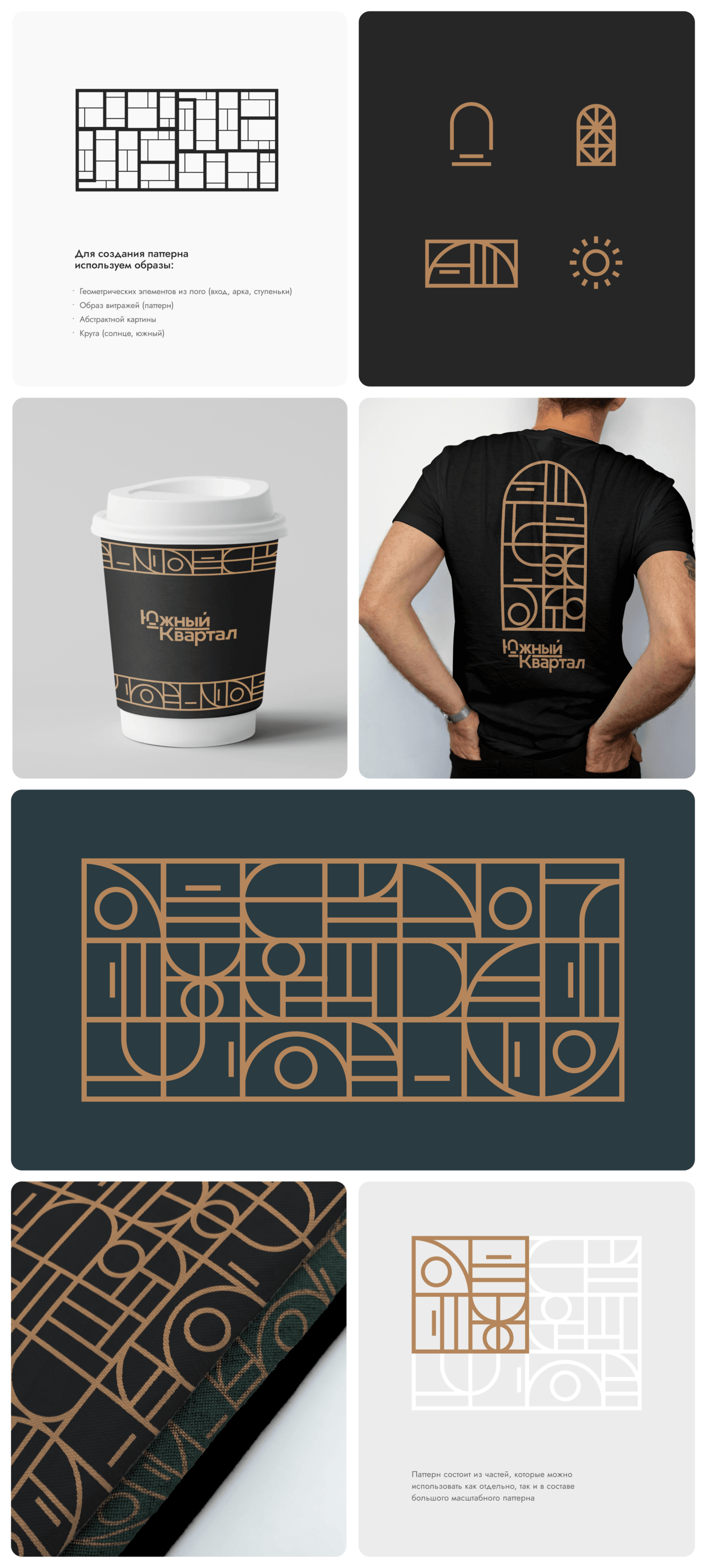 Одним из сложных элементов, который мы создали стал адаптивный фирменный паттерн-мозаику. Важно было, чтобы его можно было использовать на любых поверхностях и в разных форматах без дробления элементов, мы собрали паттерн из маленьких, но важных смысловых «кусочков» основной идеи. Арка, вход в дом, ступени, солнце, окна, юг — всё это соединяется минималистичной линейной абстракцией. Элементы образуют мозаику, витраж, что позволяет использовать паттерн как составной. Их также можно перемешивать между собой в том порядке, который учитывает длину, ширину и высоту необходимого куска паттерна.