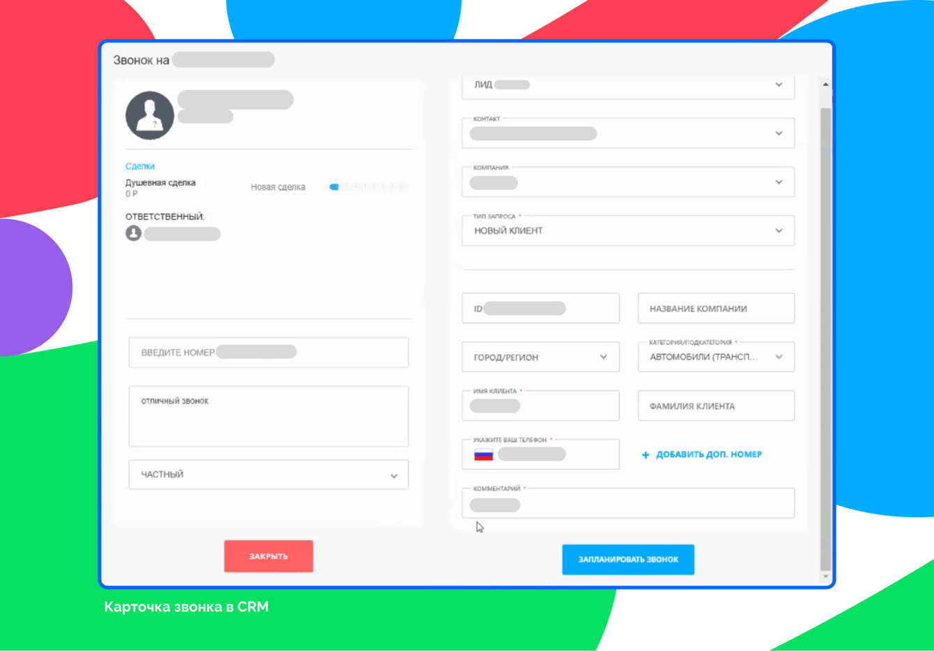 - Дополнительные поля для заполнения параметров звонка и комментария;