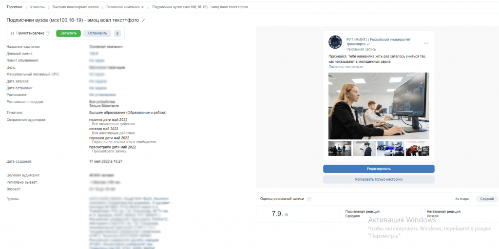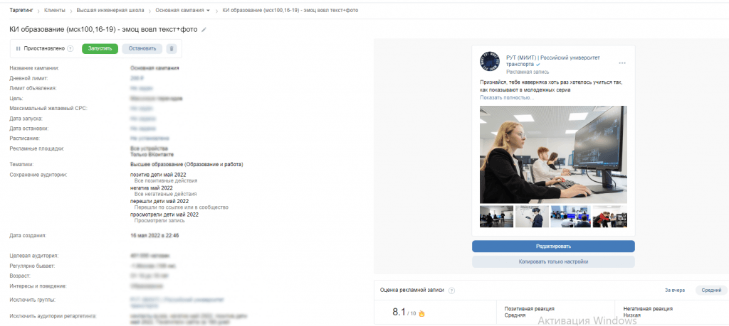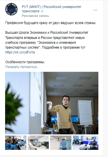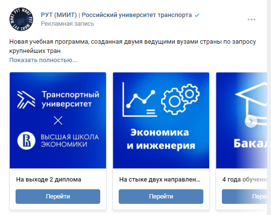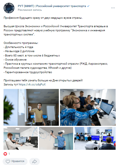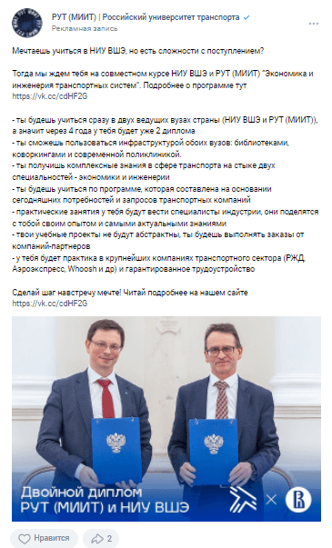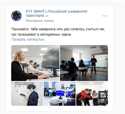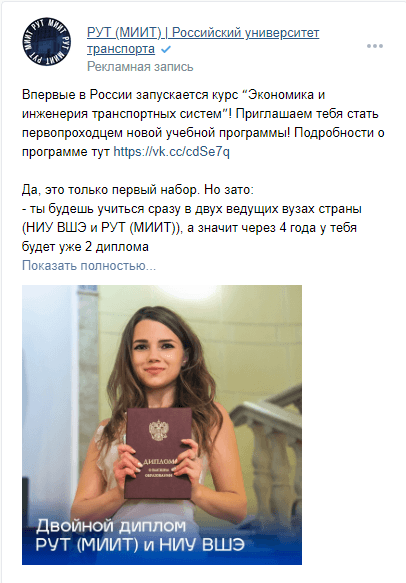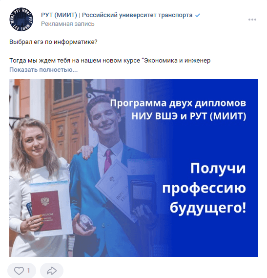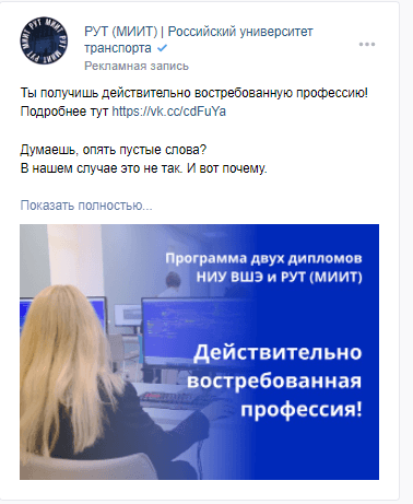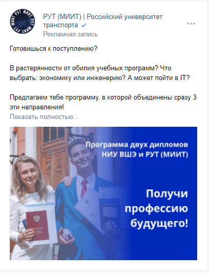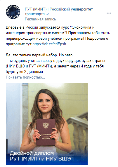 Объявления с эмоциональной вовлеченностью и принадлежностью к группе на подписчиков сообществ вузов;